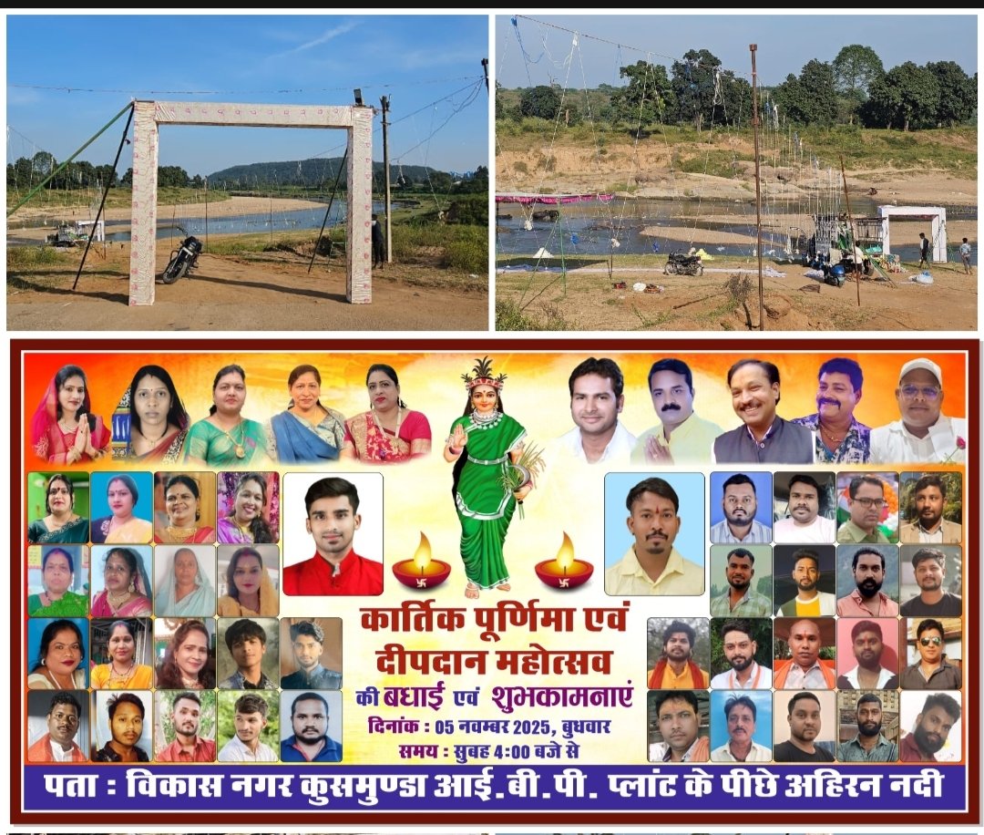 कोरबा – कल 5 नवंबर 2025 कार्तिक पूर्णिमा के अवसर पर जिले के कुसमुंडा क्षेत्र अंतर्गत विकास नगर आई बी पी प्लांट के पीछे अहिरन नदी तट पर दीप दान महोत्सव मनाया जाएगा। इस बार यह महोत्सव बड़े ही धूमधाम तरीके से मनाया जायेगा। इसके लिए क्षेत्रवासियों द्वारा एक दिन पूर्व से ही तैयारियां शुरू कर दी है। जिसके तहत नदी किनारे को लाइट, झालर सजाया जा रहा है। टेंट लगाए जा रहे हैं। आयोजन कर्ताओं ने बताया कि तड़के सुबह लगभग 4 बजे से कार्तिक पूर्णिमा एवं दीपदान महोत्सव की शुरुवात की जावेगी। जिसमें आतिशबाजी,डीजे लाइट,भोग प्रसाद, प्रमुख आकर्षण मिट्टी से बनाए शिवलिंग की पूजा होगी