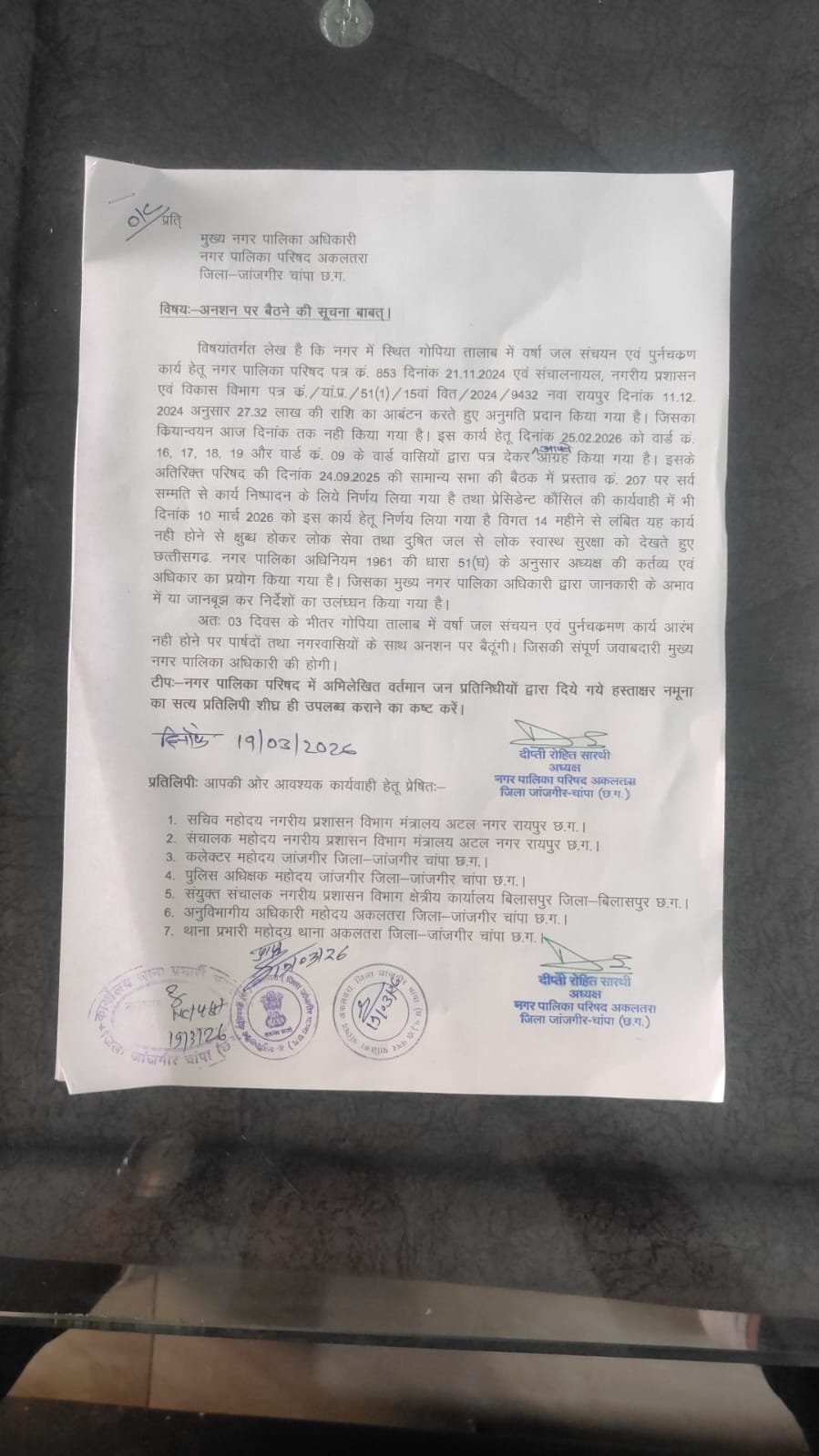 **अकलतरा नगर पालिका में जल संरक्षण कार्य में देरी पर अध्यक्ष बैठी अनशन पर, अधिकारी पर लग रहे गंभीर आरोप, **