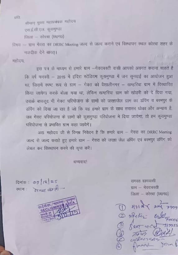 01. तत्काल DRCC बैठक:- गेवरा ग्राम के विस्थापन और मुआवज़े पर अंतिम निर्णय लेने हेतु DRCC Meeting अविलंब आयोजित की जाए ।