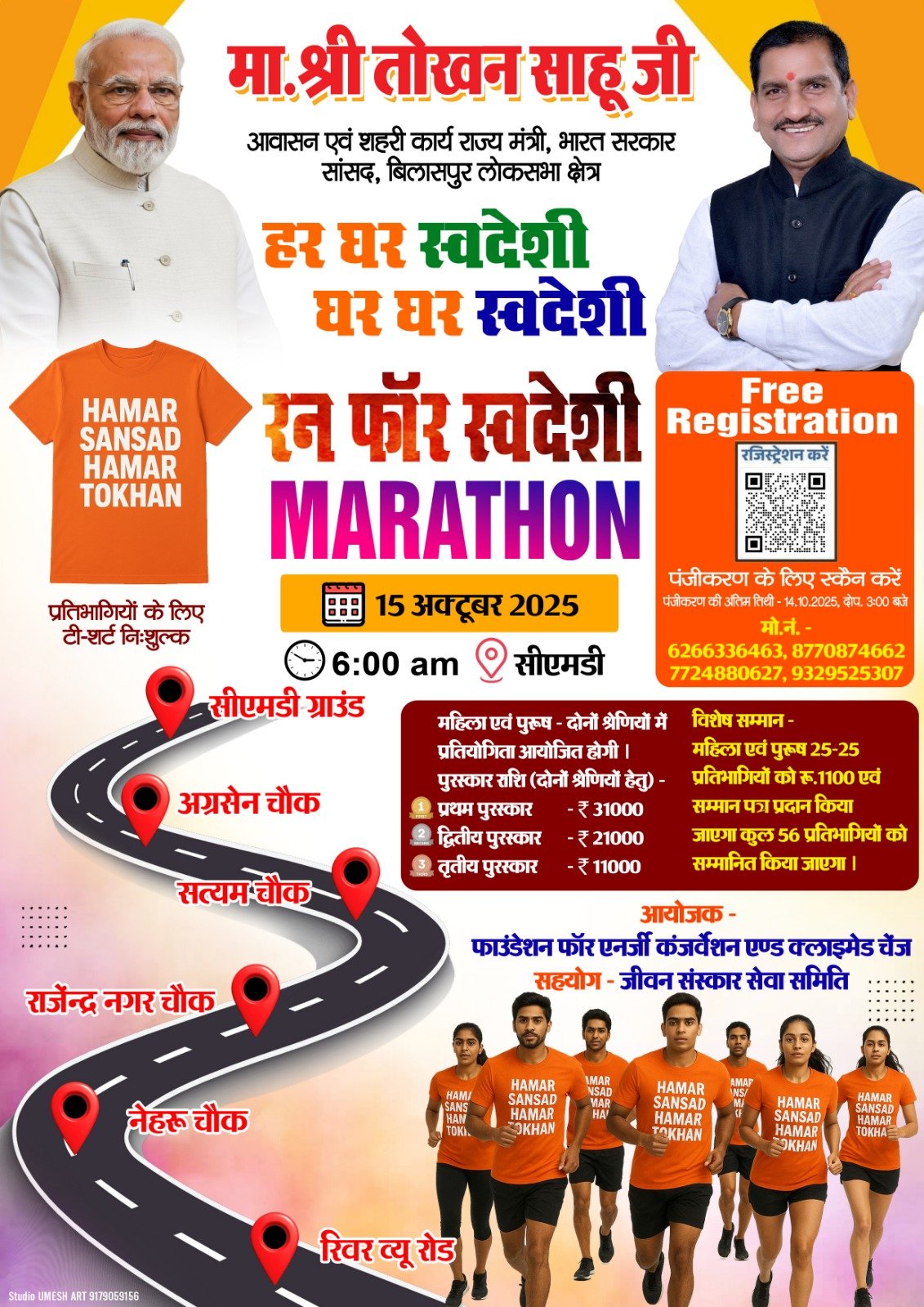 आवासन एवं शहरी कार्य राज्य मंत्री (भारत सरकार) तथा बिलासपुर लोकसभा सांसद माननीय तोखन साहू जी के 56वें जन्मदिन के अवसर पर बिलासपुर में एक विशेष कार्यक्रम ‘रन फॉर स्वदेशी’ मैराथन का आयोजन किया जा रहा है।यह आयोजन फाउंडेशन फॉर एनर्जी कंज़र्वेशन एंड क्लाइमेट चेंज द्वारा किया जा रहा है एवं जीवन संस्कार सेवा समिति सहयोगी संस्था के रूप में इस कार्यक्रम से जुड़ी है।कार्यक्रम का उद्देश्य समाज में स्वदेशी, आत्मनिर्भरता एवं सतत जीवनशैली के संदेश को जन-जन तक पहुँचाना है। इस अवसर पर क्षेत्र के युवाओं, नागरिकों, खेल प्रेमियों और सामाजिक संगठनों से बढ़-चढ़कर भागीदारी की अपेक्षा की गई है।