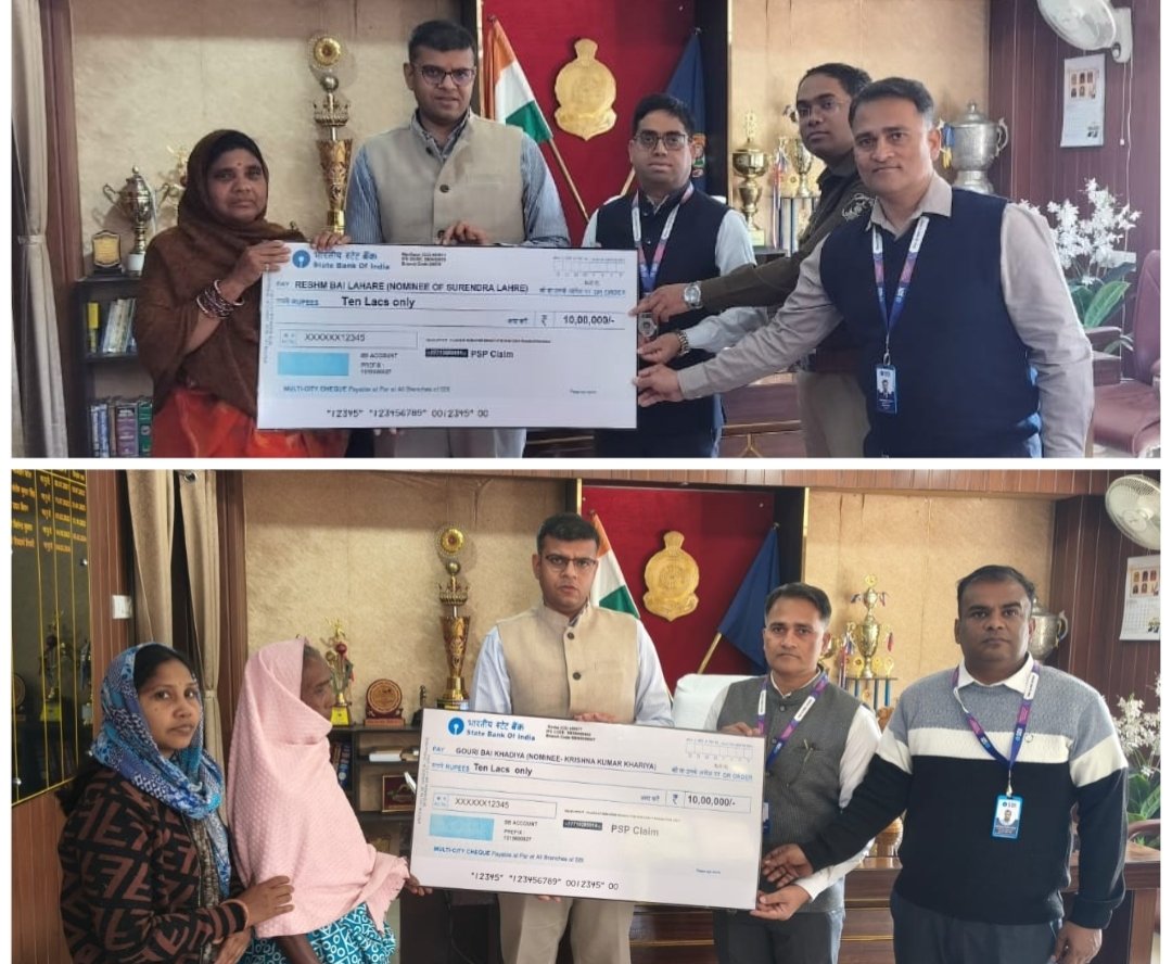 इसी क्रम में, पुलिस अधीक्षक कार्यालय में पदस्थ आरक्षक कृष्ण कुमार खड़िया ( दिनांक 28.09.2025 ) एवं आरक्षक सुरेन्द्र लहरे (दिनांक 07.09.2025) के आकस्मिक निधन के पश्चात उनके परिजनों को पुलिस सैलरी पैकेज योजना के अंतर्गत ₹10,00,000/- (दस लाख रुपये) की बीमा राशि प्रदान की गई। उक्त बीमा राशि का वितरण पुलिस अधीक्षक सिद्धार्थ तिवारी, भा.पु.से., भारतीय स्टेट बैंक के मुख्य प्रबंधक मृत्युंजय वर्मा एवं रामेश्वर कुमार, मुख्य प्रबंधक, आईटीआई शाखा कोरबा की गरिमामयी उपस्थिति में किया गया।