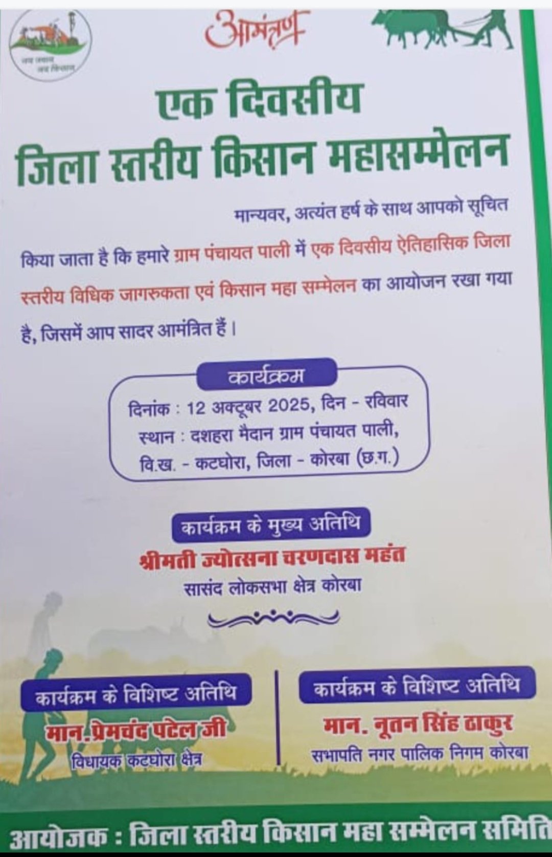 कोरबा – एक दिवसीय जिला स्तरीय किसान महासम्मेलन का आयोजन 12 अक्टूबर को दशहरा मैदान ग्राम पंचायत पाली में किया गया है। कार्यक्रम की मुख्य अतिथि सांसद ज्योत्सना महंत, विशिष्ट अतिथि विधायक प्रेमचंद पटेल, निगम सभापति नूतन सिंह ठाकुर होंगे। कार्यक्रम का शुभारंभ प्रातः 11 दीप प्रज्जवलन के साथ होगा। शाम 4.30 बजे कार्यक्रम का समापन होगा। कार्यक्रम के आयोजक पाली, चन्द्रनगर, पड़निया, सोनपुरी, रिस्दी, खोडरी, चुरैल, आमगांव व खैरभावना ग्राम समिति है।