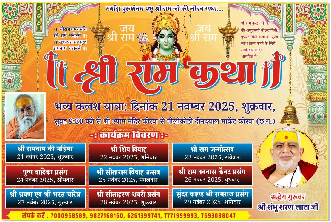 कोरबा में श्री राम कथा का आरंभ 21 नवंबर से, पीलीकोठी परिसर में होगा भव्य आयोजन