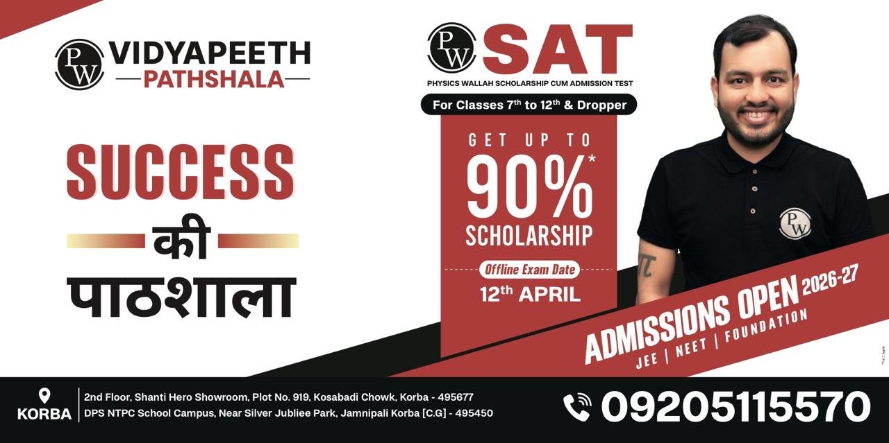 कोरबा – शहर के विद्यार्थियों के लिए एक बड़ा शैक्षणिक अवसर सामने आया है। *Physics Wallah Vidyapeeth Pathshala, Korba* द्वारा आगामी *12 अप्रैल* को *Mega Offline Scholarship Test (SAT)* आयोजित किया जा रहा है, जिसके माध्यम से छात्रों को *90% तक स्कॉलरशिप* प्राप्त करने का सुनहरा मौका मिलेगा। यह परीक्षा विशेष रूप से कक्षा 8वीं से 12वीं तक के विद्यार्थियों तथा JEE/NEET की तैयारी कर रहे छात्रों के लिए रखी गई है, ताकि उन्हें कम शुल्क में बेहतर गुणवत्ता वाली ऑफलाइन कोचिंग उपलब्ध कराई जा सके।