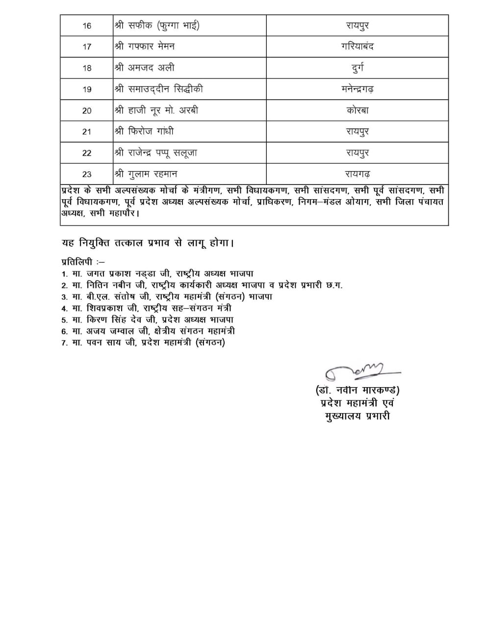 छत्तीसगढ़ भाजपा ने की भाजपा अल्पसंख्यक मोर्चा प्रदेश पदाधिकारियों की घोषणा।
