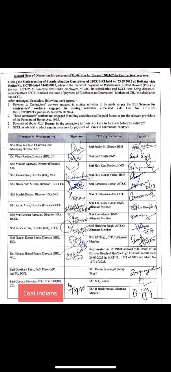 कोयला एवं खान मंत्री जी. किशन रेड्डी के मार्गदर्शन में कोल इंडिया एवं सहायक कंपनियों के कर्मियों के लिए वित्त वर्ष 2024-25 का परफॉरमेंस लिंक्ड रिवार्ड (PLR) स्वीकृत। एसईसीएल के प्रत्येक कर्मी को ₹1,03,000 का लाभ मिलेगा। 34,500 से अधिक कर्मियों के खाते में पहुंचेंगे लगभग ₹356 करोड़ रुपए। एसईसीएल ने इस अवसर पर सभी को बधाई प्रेषित की है। आपको बता दें दशहरा बोनस 2025,दिनांक 25.09.2025 को कोलकाता में संपन्न हुए मानकीकरण की बैठक में दशहरा बोनस रू 1,03,000/- तय हुआ l दिनांक 26.09.2025 तक सभी कोयला कामगारों के बैंक खातों में जमा किया जाएगा l ठेका श्रमिकों को (माइनिंग – नाॅन माइनिंग दोनों को) 8.33 % से बोनस मिलेगा l अखिल भारतीय खदान मजदूर संघ ने भी सभी कोयला कामगारों को ढेर सारी शुभकामनाएं प्रेषित की है।