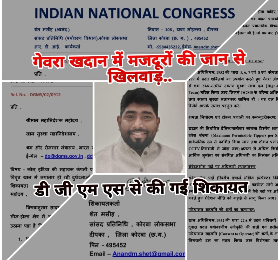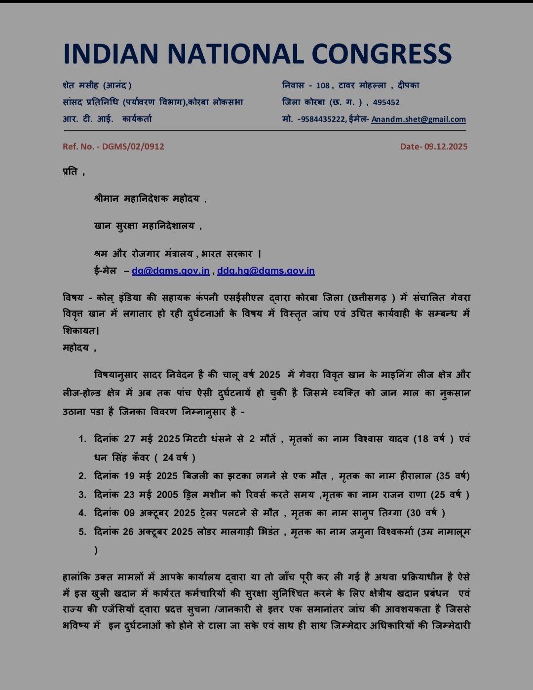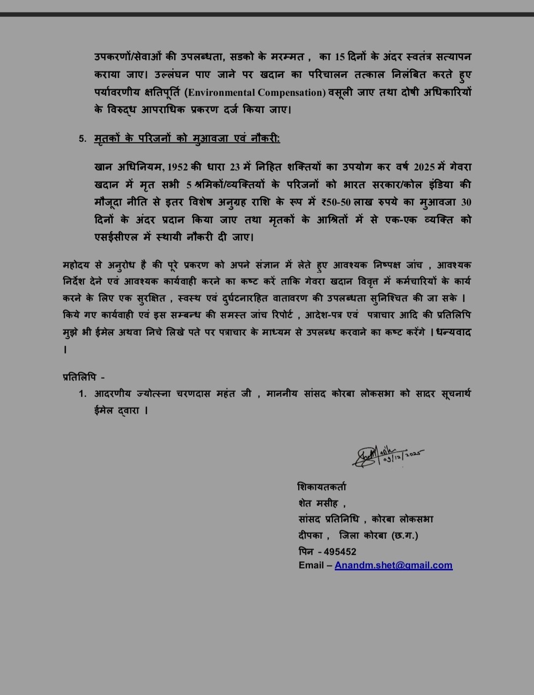 कोरबा लोकसभा के सांसद प्रतिनिधि (पर्यावरण विभाग) एवं वरिष्ठ आरटीआई कार्यकर्ता श्री शेत मसीह ने आज खान सुरक्षा महानिदेशालय (DGMS), धनबाद के महानिदेशक को 05 पन्नों का विस्तृत शिकायत-पत्र ई-मेल एवं स्पीड पोस्ट से भेजा है। पत्र में दुर्घटनाओं के पाँच प्रमुख कारणों का गहराई से विश्लेषण किया गया है और हर कारण के साथ सबूत व कानूनी प्रावधानों का उल्लेख है।