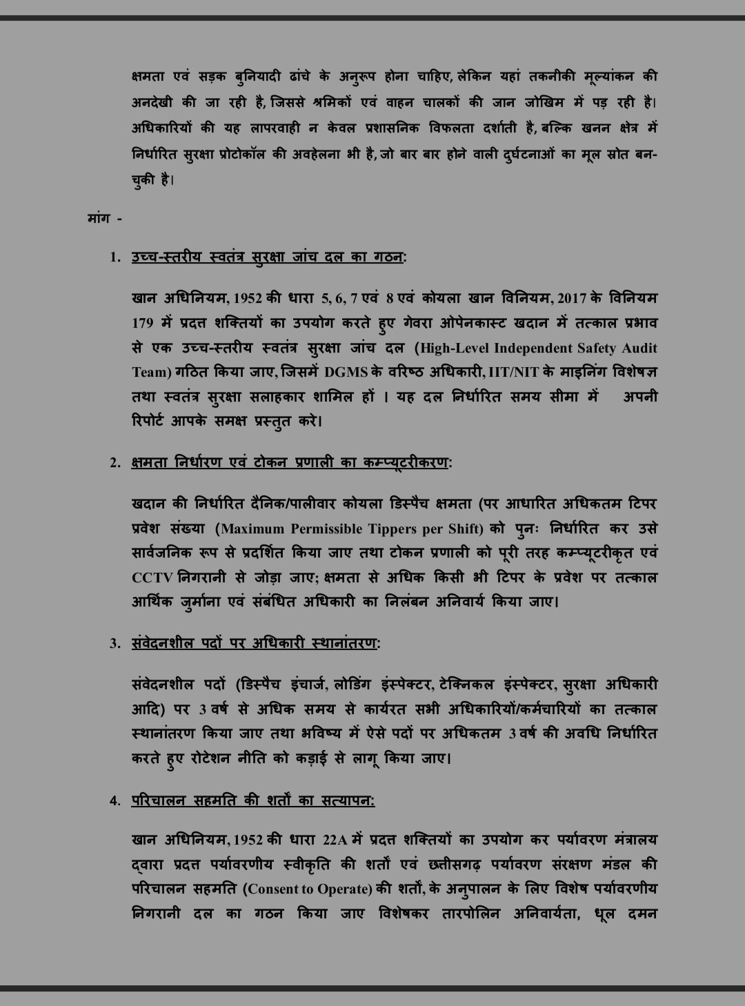 1. IIT/NIT के माइनिंग विशेषज्ञों और DGMS के वरिष्ठ अधिकारियों की स्वतंत्र उच्च-स्तरीय सुरक्षा जाँच टीम तुरंत गठित की जाए।