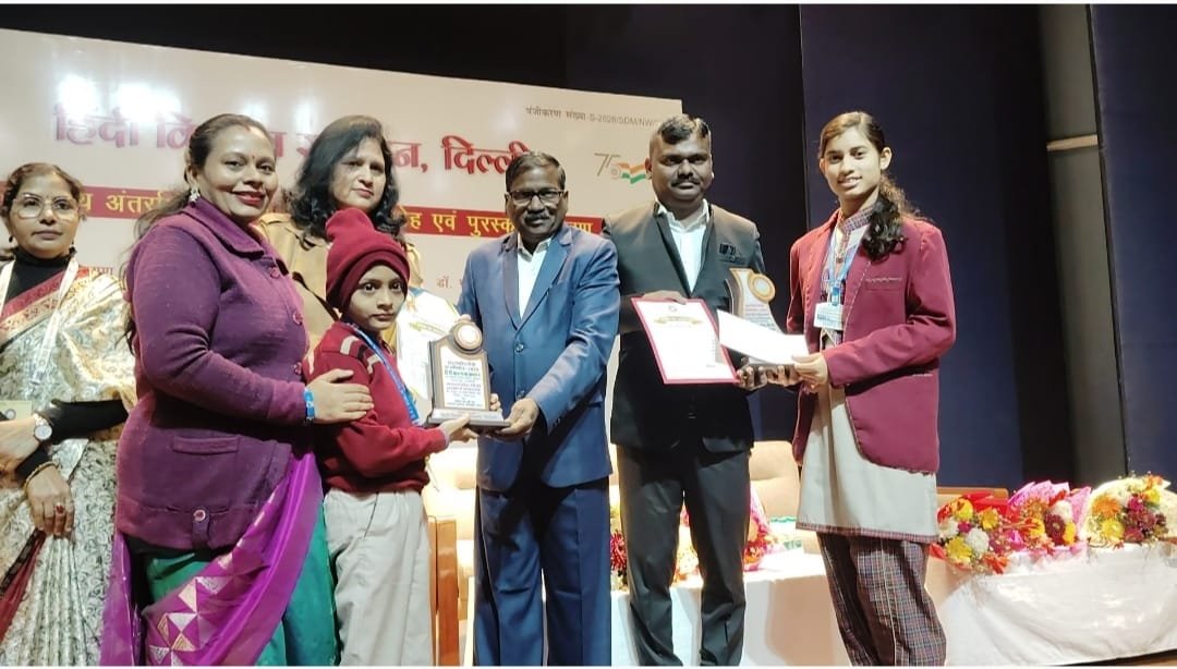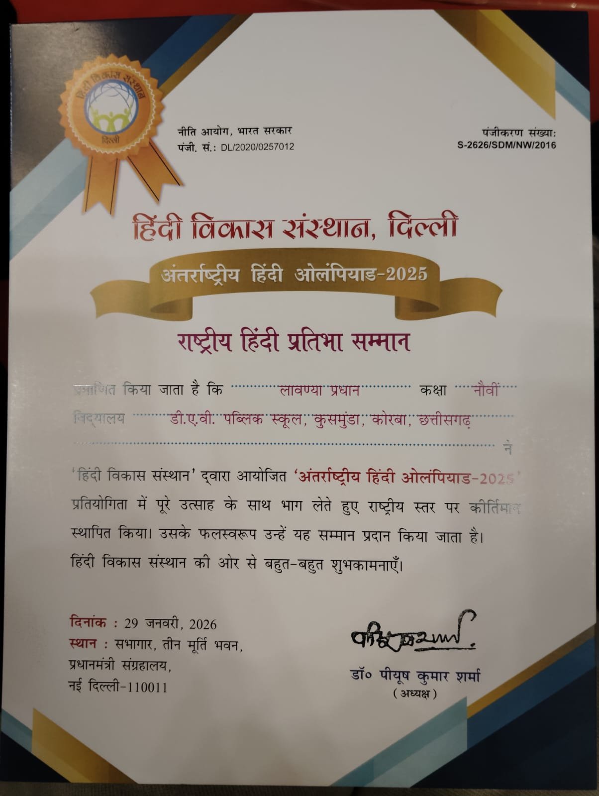 हिन्दी विकास संस्थान दिल्ली द्वारा आयोजित अंतर्राष्ट्रीय हिन्दी ओलांपियार्ड प्रतियोगिता में डी. ए. व्ही. पब्लिक स्कूल कुसमुण्डा जिला कोरबा, (छ. ग.) कक्षा 9वीं की छात्रा कु. लावण्य प्रधान को स्वर्ण पदक, राष्ट्रीय हिन्दी प्रतिभा सम्मान एवं नगद राशि दिनांक 29 जनवरी को तीन मूर्ति भवन, प्रधानमंत्री संग्रहालय नई दिल्ली के सभागार में मुख्य अतिथि डॉ. विनोद नारायण इंदूरकर – अध्यक्ष सांस्कृतिक स्रोत एवं प्रशिक्षण केंद्र संस्कृति मंत्रालय, भारत सरकार, डॉ पाटिल प्रांजल लहँसिंह (I. A. S) अतिरिक्त शिक्षा निदेशक शिक्षा निदेशालय दिल्ली सरकार, डॉ पूरन चंद्र टंडन – निदेशक, भारतीय अनुवाद परिषद, नई दिल्ली, डॉ कैलाश जाधव संयोजक, गोवा हिन्दी अकादमी, गोवा के द्वारा प्रदान किया गया है ।