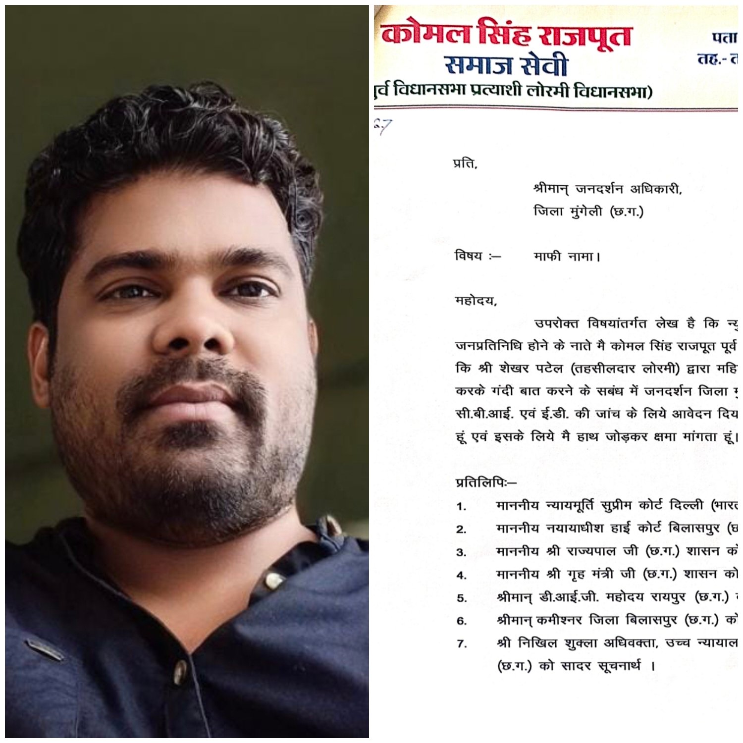 मुंगेली | लोरमी तहसील में पदस्थ तहसीलदार श्री शेखर पटेल के विरुद्ध लगाए गए गंभीर आरोपों के मामले में एक अहम और निर्णायक मोड़ सामने आया है। समाजसेवी एवं पूर्व विधानसभा प्रत्याशी कोमल सिंह राजपूत ने जिला जनदर्शन अधिकारी, मुंगेली के समक्ष अपने द्वारा लगाए गए आरोपों को लेकर लिखित रूप से माफी प्रस्तुत की है। जनदर्शन में प्रस्तुत माफीनामे में कोमल सिंह राजपूत ने स्वीकार किया है कि टोकन क्रमांक 15526 के अंतर्गत तहसीलदार शेखर पटेल पर महिला कर्मचारियों से वीडियो कॉल के माध्यम से अशोभनीय बातचीत करने तथा उनके विरुद्ध CBI और ED जांच की मांग संबंधी शिकायत के लिए वे क्षमाप्रार्थी हैं। माफीनामे में उन्होंने हाथ जोड़कर अपनी गलती स्वीकार करते हुए माफी मांगी है।