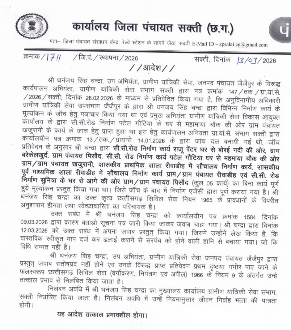 जांच में पाया गया कि उप अभियंता धनंजय सिंह चन्द्रा का यह कृत्य छत्तीसगढ़ सिविल सेवा नियम 1965 के प्रावधानों के विपरीत, अनुशासनहीनता तथा स्वेच्छाचारिता का परिचायक है। इस संबंध में श्री धनंजय सिंह चन्द्रा को कार्यालयीन पत्र के माध्यम से कारण बताओ सूचना पत्र जारी कर जवाब प्रस्तुत करने का अवसर दिया गया था। उन्होंने 12 मार्च 2026 को अपना जवाब प्रस्तुत किया, जिसमें उन्होंने लिखा कि वास्तविक स्वीकृत माप दर्ज कर ढलाई कराने से सरपंच को होने वाली हानि से बचाया गया, जो कि विधिसम्मत नहीं पाया गया। प्रस्तुत जवाब संतोषजनक नहीं पाए जाने तथा जांच प्रतिवेदन में प्रथम दृष्टया गंभीर अनियमितता पाए जाने के कारण छत्तीसगढ़ सिविल सेवा (वर्गीकरण, नियंत्रण एवं अपील) नियम 1966 के नियम 9 के अंतर्गत श्री धनंजय सिंह चन्द्रा, उप अभियंता ग्रामीण यांत्रिकी सेवा जनपद पंचायत जैजैपुर को तत्काल प्रभाव से निलंबित कर दिया गया है। निलंबन अवधि के दौरान उनका मुख्यालय कार्यालय ग्रामीण यांत्रिकी सेवा संभाग सक्ती निर्धारित किया गया है तथा नियमानुसार उन्हें जीवन निर्वाह भत्ता की पात्रता होगी। यह आदेश तत्काल प्रभाव से लागू किया गया है।