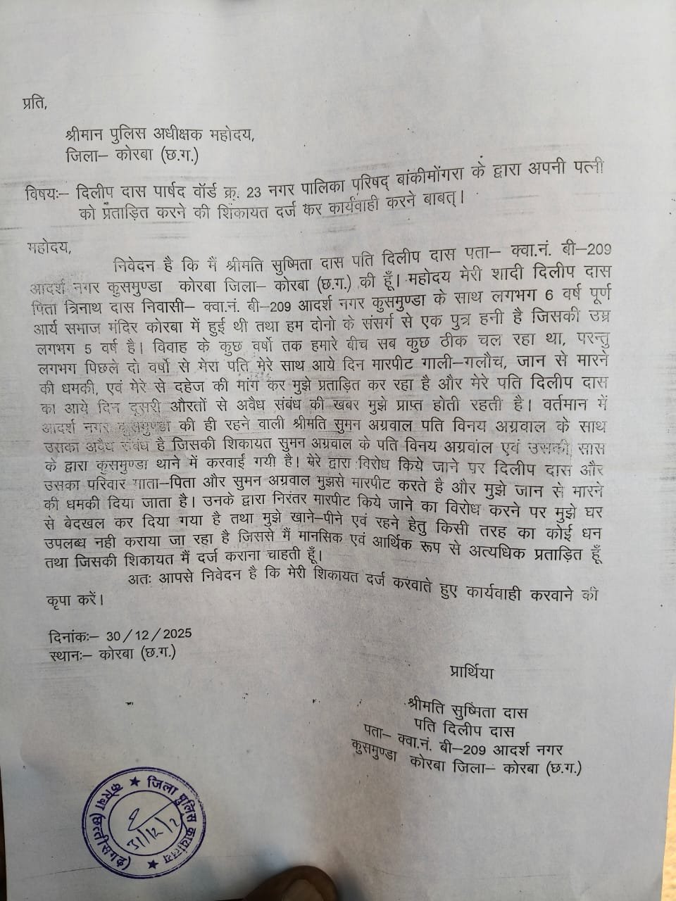 पार्षद दिलीप दास पर पत्नी ने लगाया मारपीट और प्रताड़ना का आरोप, एसपी से की गई शिकायत