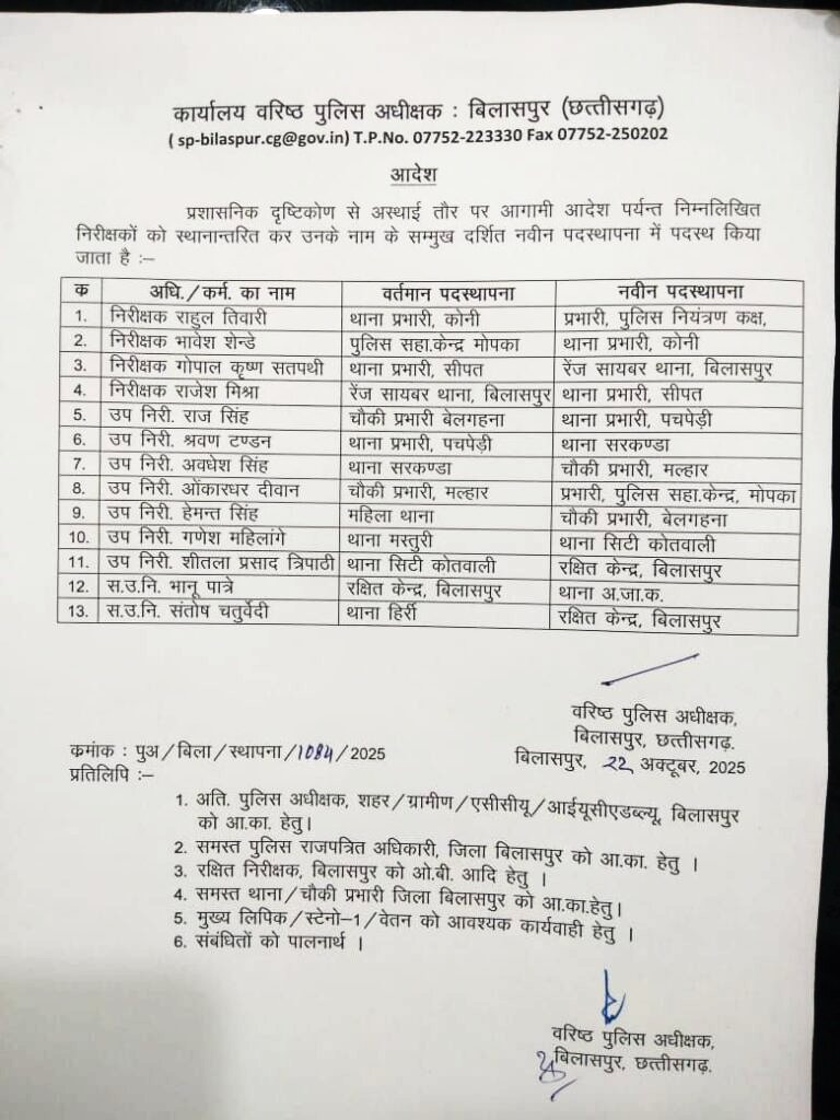 बिलासपुर, सीपत थाने के शौचालय के दरवाजे में पीएम और सीएम के बैनर का इस्तेमाल किए जाने के मामले में सीपत थानेदार गोपाल कृष्ण सतपथी को एसपी ने हटा दिया है सतपथी को सायबर सेल भेजा गया है सायबर सेल के राजेश मिश्रा को सीपत थाना प्रभारी बनाया गया है कोनी टी आई राहुल तिवारी को पुलिस कंट्रोल रूम भेजा गया है, भावेश शेंडे को कोनी थाना प्रभारी बनाया गया है,ए एस आई अवधेश सिंह को मल्हार चौकी प्रभारी बनाया गया है, ए एस आई राज सिंह को बेलगहना से पचपेड़ी थाना प्रभारी बनाया गया है , ए एस आई श्रवण टंडन पचपेड़ी से सरकंडा , ओंकार धर दीवान मल्हार चौकी से मोपका भेजा गया है ,