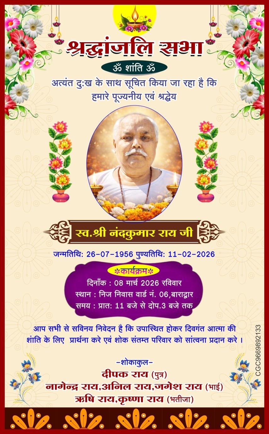 बराद्वार। क्षेत्र के सम्मानित एवं पूजनीय व्यक्तित्व स्वर्गीय श्री नंदकुमार राय जी के निधन पर उनके निवास स्थान वार्ड क्रमांक 06, बराद्वार में श्रद्धांजलि सभा का आयोजन किया जा रहा है। परिवारजनों द्वारा दी गई जानकारी के अनुसार श्रद्धांजलि सभा दिनांक 08 मार्च 2026, रविवार को आयोजित होगी।