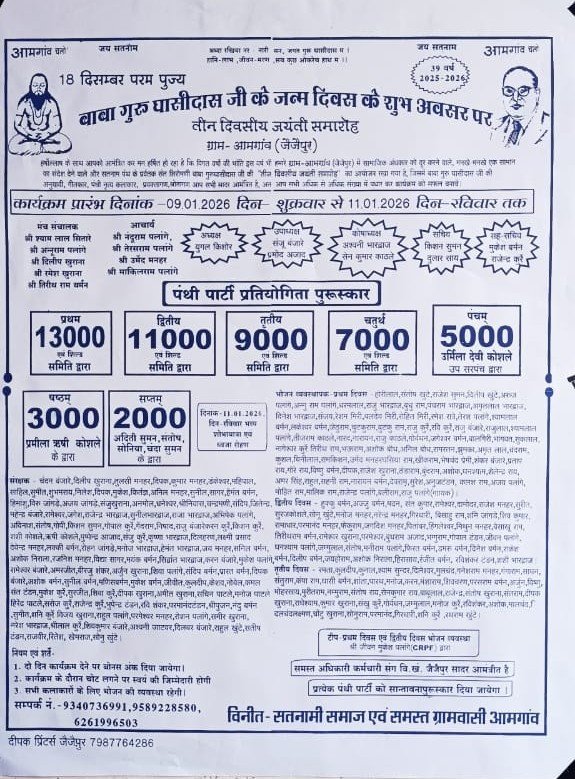 सक्ती:: बाबा गुरु घासीदास जी के जन्मदिवस पर ग्राम आमगांव में 9 तारीख से 11 तारीख तक तीन दिवसीय जयंती का कार्यक्रम रखा गया है जिसमें पंथी पार्टी प्रतियोगिता पुरस्कार भी रखा गया है जिसमें आकर्षक सात पुरस्कार है जिसमें