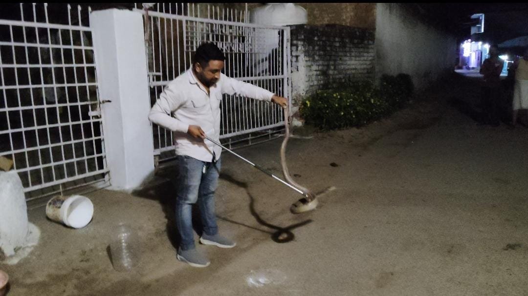 कोरबा – कोरबा शहर से 20 किलोमीटर दूर कुदुरमाल गांव में उस समय हड़कंप मच गया जब गली में बैठे ग्रामीणों ने अपने तरफ आते एक बेहद बड़े नाग को देखा, देखते ही देखते लोगों की भीड़ इकट्ठा हो गई, इतने बड़े नाग को देख कर बच्चे, महिलाएं एवं वरिष्ठ जन हक्के बक्के रह गए की आखिरकार इतना बड़ा नाग आया कहा से फिर गांव के ही हरिशंकर पटेल ने बड़ी बहादुरी से एक किनारे बाल्टी को रख दिया जिसमें वो नाग घुस गया और कुण्डी मार कर बैठ गया फिर बाल्टी को सीधा कर के ढक दिया गया फिर गांव के युवक हरिशंकर पटेल ने इसकी जानकारी वाइल्डलाइफ रेस्क्यु टीम प्रमुख सदस्य जितेंद्र सारथी को दिया गया जिस पर सारथी ने थोड़ी देर में पहुंचने की बात कही तब तक गांव वाले वहीं बैठ कर रेस्क्यु टीम आने का इंतजार करते रहे आखिरकार कुछ घंटे के बाद जितेंद्र सारथी अपने टीम राजू बर्मन, बबलू मारवा, शुभम के साथ वहां पहुंचे और बड़ी सावधानी से बाल्टी के अंदर से 6 फिट के विशालकाय नाग को बाहर निकाला और बड़ी ही सावधानी से कोबरा को डिब्बे में रखा, पूरे रेस्क्यु ऑपरेशन को देख कर गांव वाले हक्के बक्के रह गए साथ ही सुरक्षित महसूस करने लगे फिर गांव वालों ने रेस्क्यु टीम का धन्यवाद ज्ञापित किया फिर नाग को सुरक्षित उसके प्राकृतिक रहवास जंगल में छोड़ दिया गया।