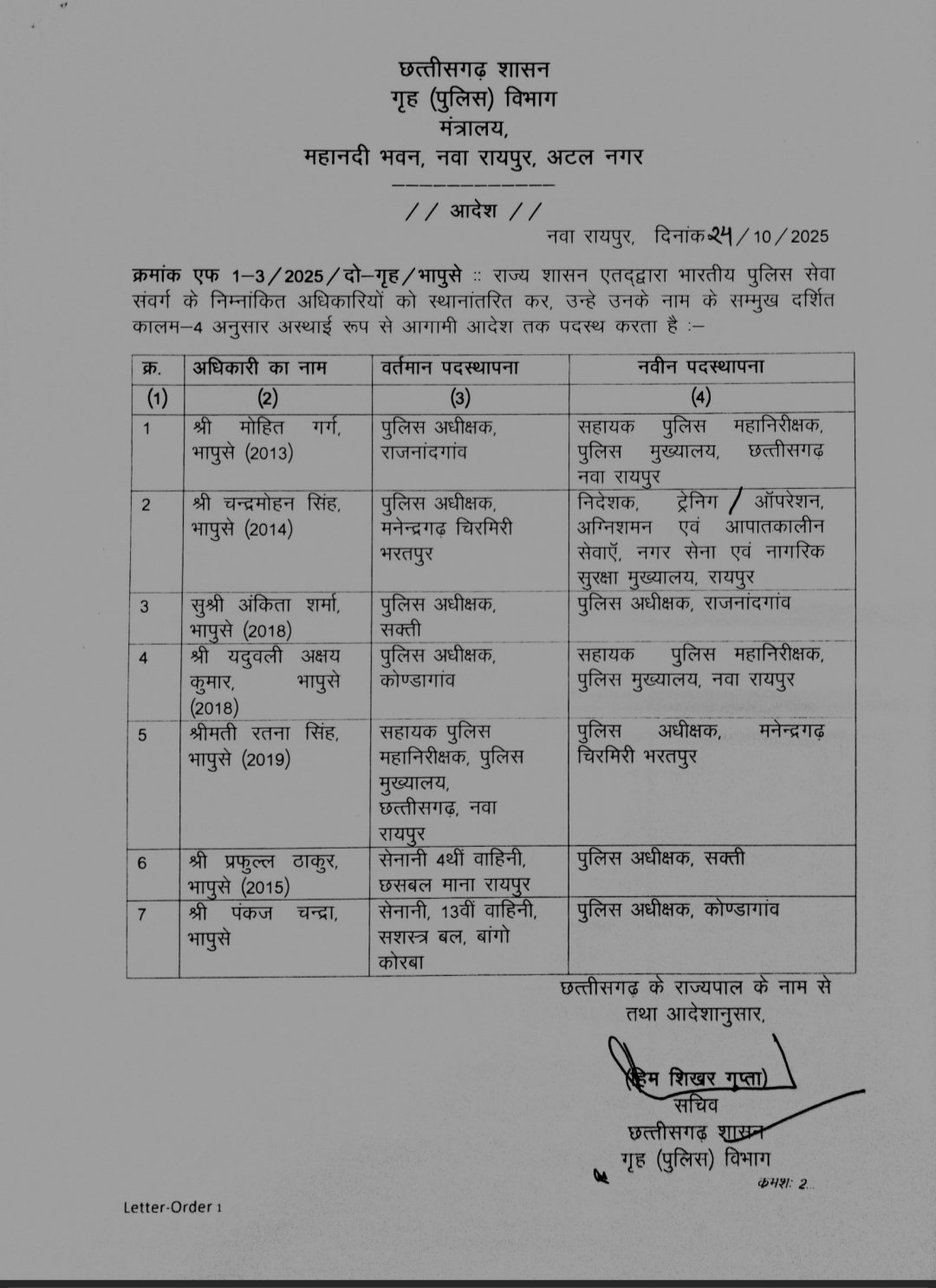 ब्रेकिंग छत्तीसगढ़ 7 आई पी एस का हुआ तबादला, सक्ति, राजनांदगांव सहित कई जिलों के एसपी बदले, देखें लिस्ट