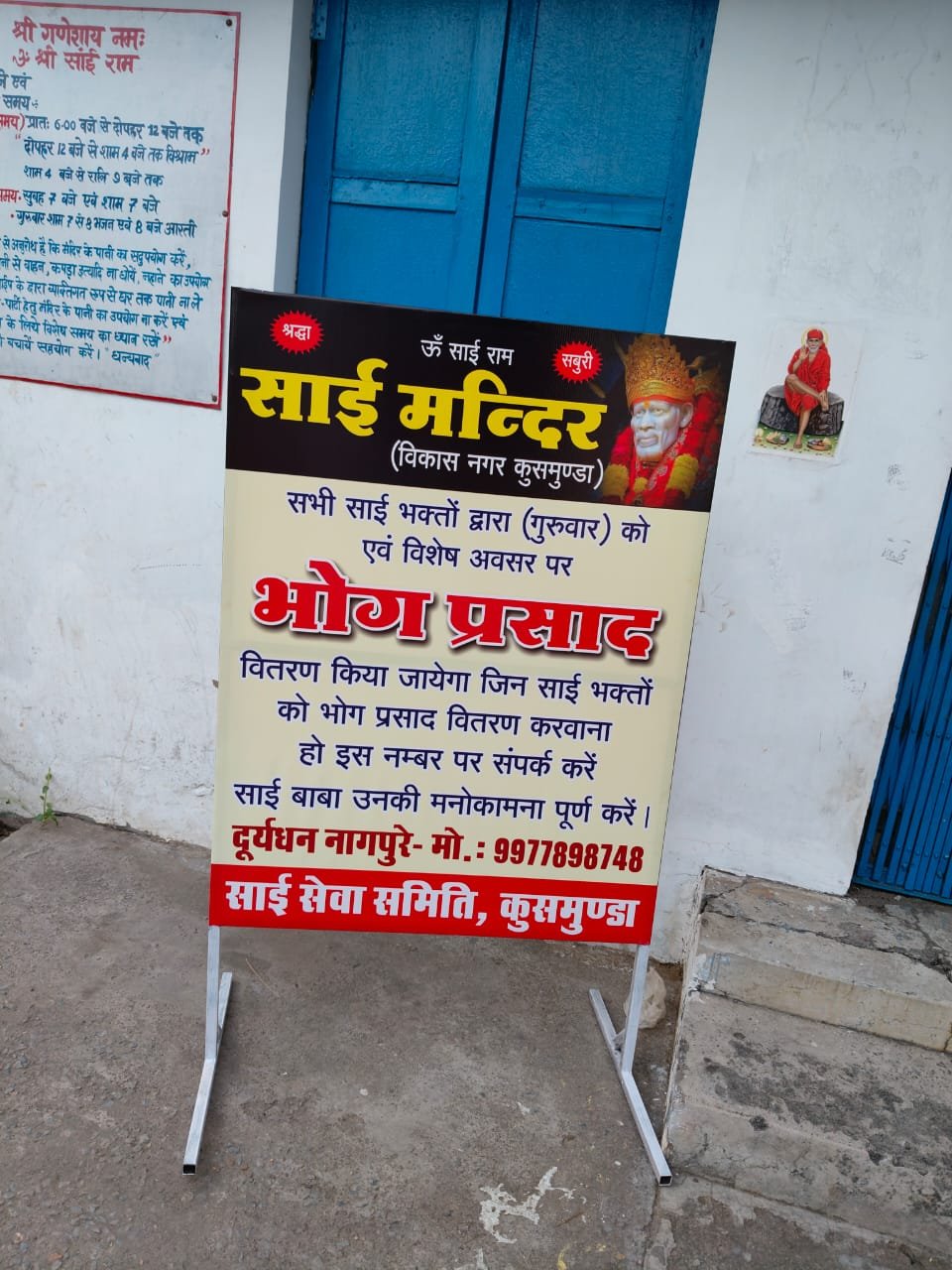 कोरबा जिले के विकास नगर अंतर्गत कला मंदिर प्रांगण में स्थित सत्य श्री साईं मंदिर में साईं भक्तों द्वारा भोग भंडारे का आयोजन किया गया। जिसमें चना प्रसाद के रूप में भोग का वितरण किया गया। साईं सेवा समिति द्वारा जिन भी भक्तों को प्रसाद का वितरण कराना होगा वे समिति के सक्रिय सदस्य दुर्योधन नागपुरे से संपर्क करने की अपील की गई है। दुर्योधन नागपुरे जी का मोबाइल नंबर 9977898748 है जिनमें सभी संपर्क कर सकते हैं।