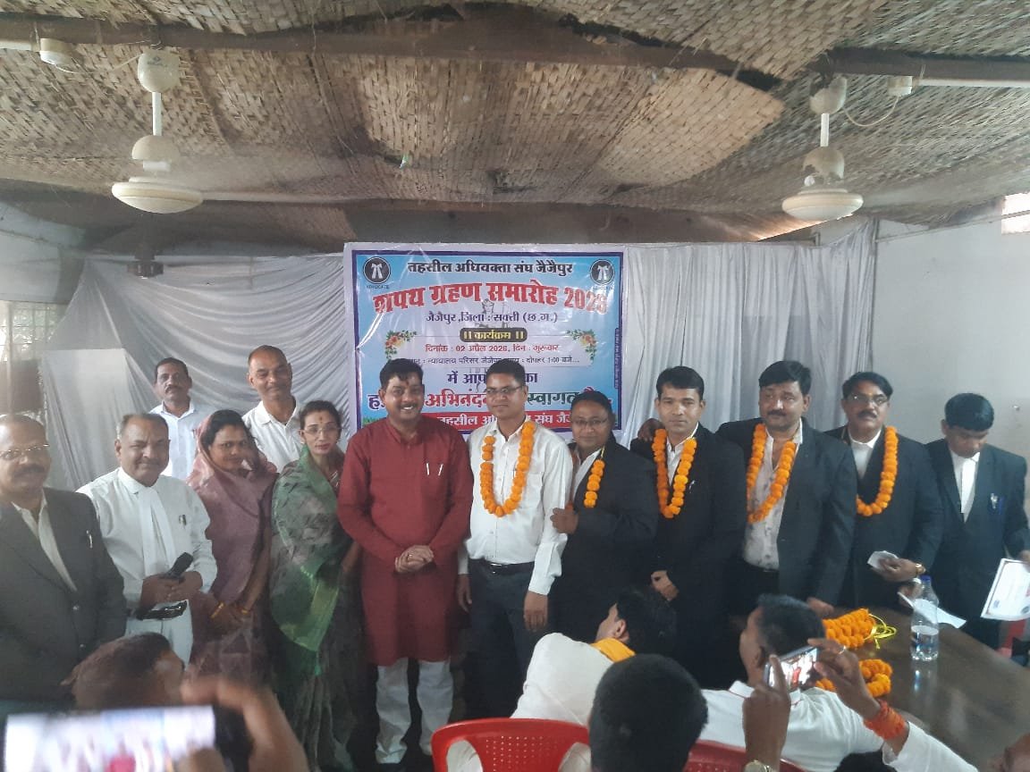 सक्ती तहसील अधिवक्ता संघ जैजैपुर के नवनिर्वाचित पदाधिकारियों ने गुरुवार, 2 अप्रैल को पद व गोपनीयता की शपथ ली। न्यायालय परिसर जैजैपुर में आयोजित हुए इस शपथग्रहण समारोह के मुख्य अतिथि जैजैपुर विधायक बालेश्वर साहू रहे। विशिष्ट अतिथियों में अधिवक्ता चंद्र प्रकाश जांगड़े, उच्च न्यायालय अधिवक्ता जी.के.गुजराल, भटगांव अध्यक्ष अधिवक्ता जगेश्वर लहरे, जिला पंचायत अध्यक्ष श्रीमती द्रौपदी -कीर्तन चंद्रा, जनपद पंचायत अध्यक्ष श्रीमती पुष्पा -परदेशी खुंटे, सरपंच संघ जैजैपुर के अध्यक्ष ऋषि बनाफर , परदेशी कुंटे सहित अतिथि गण उपस्थित रहे। इस मौके पर अधिवक्ता चंद्र प्रकाश जांगड़े ने अधिवक्ता संघ जैजैपुर के नवनिर्वाचित अध्यक्ष सेतराम कुर्रे, उपाध्यक्ष विजय कुमार चंद्रा, सचिव रवि लाल रात्रे, सहसचिव अनित कुमार कुर्रे, कोषाध्यक्ष सचिन कुमार सिंह सहित सभी पदाधिकारियों को पद व गोपनीयता की शपथ दिलाई। इस मौके पर मुख्य अतिथि जैजैपुर विधायक बालेश्वर साहू ने अधिवक्ता संघ जैजैपुर के हित व विकास के कार्यों के लिए हमेशा तत्पर रहने की बात कही। इस मौके पर विधायक बालेश्वर ने सभी नवनिर्वाचित पदाधिकारियों को बधाई व शुभकामनाएं देते हुए सभी अधिवक्ताओं से न्याय की रक्षा करने की बात कही। इस मौके पर जैजैपुर विधायक ने जैजैपुर अधिवक्ता संघ के समुचित बैठक व्यवस्था के लिए 20 टेबल-कुर्सी के साथ -साथ स्वच्छ पेयजल के लिए आरो प्रदान करने की घोषणा किया । इन पलों में कार्यक्रम में उपस्थित छत्तीसगढ़ अधिवक्ता परिषद के सदस्य अधिवक्ता चंद्र प्रकाश जांगड़े ने सभी नवनिर्वाचित पदाधिकारियों को अपनी शुभकामनाएं देते हुए कहा की नयी कमेटी पुरानी कमेटी के अनुभवों का लाभ लेते हुए संघ को एक अच्छे दिशा में ले जाएंगे। इस मौके पर अधिवक्ता श्री जांगड़े ने अधिवक्ताओं को न्याय के प्रति सजग रहने की बात कहते हुए बार व बेंच के बीच संबंध बनाए रखने की बात कही। वरिष्ठ अधिवक्ता तथा छग राज्य अधिवक्ता परिषद बिलासपुर के सदस्य गणेश गुजराल ने अपने उद्बोधन में अधिवक्ताओं को वकीलों के महत्व से अवगत कराया और उन्हें स्मार्ट में और सुपर में बताया। इन पलों में श्री गुजराल ने सभी वकीलों को संविधान की प्रति अपने घरों में रखकर उसके नित्य अध्ययन करने की बात कही। जिला पंचायत अध्यक्ष श्रीमती द्रौपदी -कीर्तन चंद्रा और जनपद पंचायत अध्यक्ष श्रीमती पुष्पा -परदेशी खुंटे ने भी सभी नवनिर्वाचित पदाधिकारियों को अपनी बधाई व शुभकामनाएं दीं और सभी से अपने दायित्वों का निर्वहन निष्ठा व ईमानदारी से करने की बात कही। इसके नवनिर्वाचित अध्यक्ष सेतराम कुर्रे ने स्वागत भाषण देते हुए अध्यक्ष पद पर ताजपोशी के लिए सभी के प्रति आभार जताया और अधिवक्ता संघ के अध्य