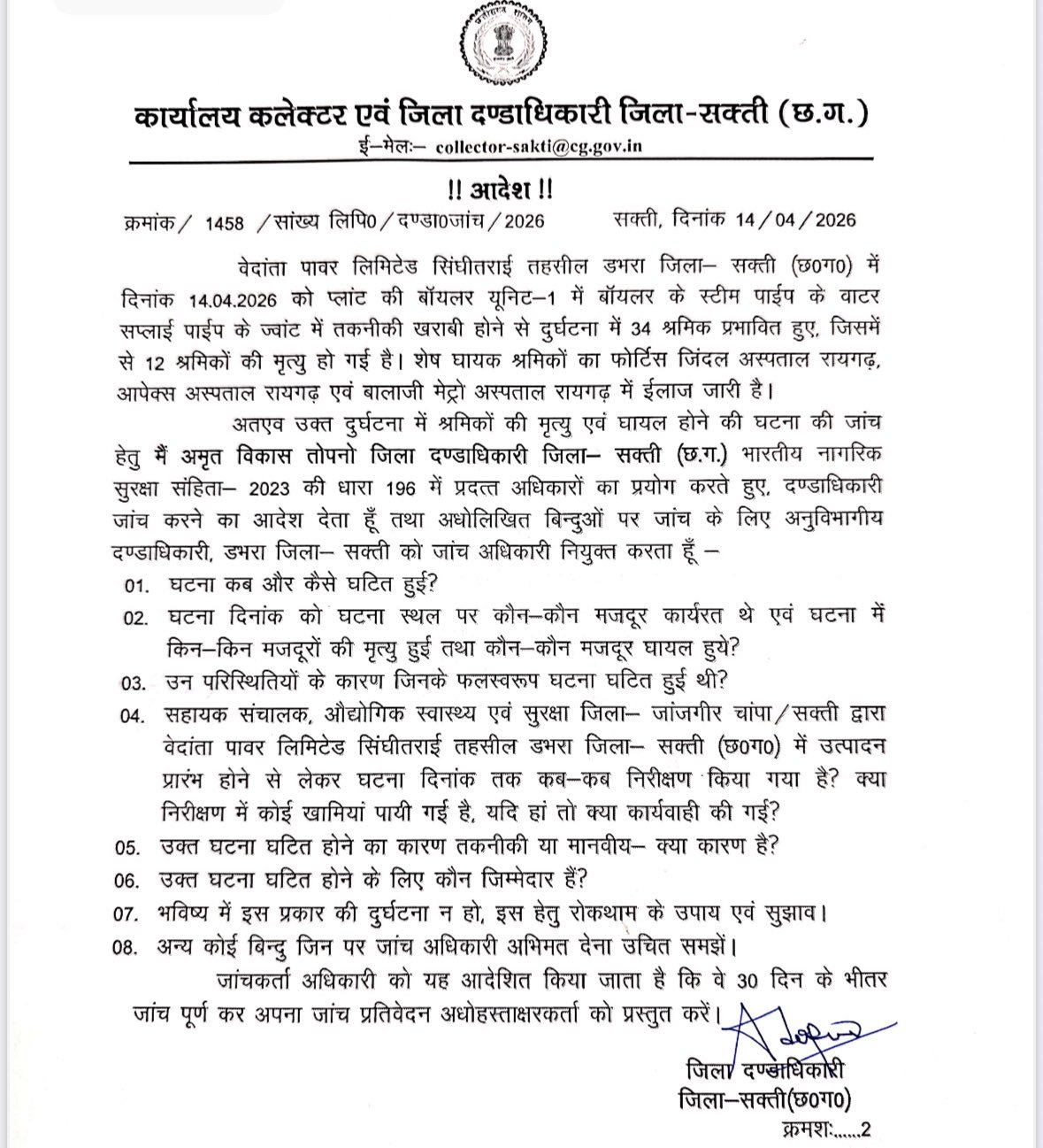 सक्ती, 15 अप्रैल 2026// जिला सक्ती अंतर्गत तहसील डभरा के ग्राम सिंघीतराई स्थित वेदांता पावर लिमिटेड में दिनांक 14 अप्रैल 2026 को प्लांट की बॉयलर यूनिट-1 में बॉयलर के स्टीम पाईप के वाटर सप्लाई पाईप के ज्वांट में तकनीकी खराबी होने से दुर्घटना में 34 श्रमिक प्रभावित हुए, जिसमें से 12 श्रमिकों की मृत्यु हो गई है। शेष घायल श्रमिकों का फोर्टिस जिंदल अस्पताल रायगढ़, आपेक्स अस्पताल रायगढ़ एवं बालाजी मेट्रो अस्पताल रायगढ़ में इलाज जारी है। उक्त दुर्घटना में श्रमिकों की मृत्यु एवं घायल होने की घटना की जांच हेतु मुख्यमंत्री श्री विष्णु देव साय के निर्देश पर कलेक्टर एवं जिला दंडाधिकारी श्री अमृत विकास तोपनो ने भारतीय नागरिक सुरक्षा संहिता-2023 की धारा 196 में प्रदत्त अधिकारों का प्रयोग करते हुए दण्डाधिकारी जांच करने का आदेश दे दिया है तथा अधोलिखित बिन्दुओं पर जांच के लिए अनुविभागीय दण्डाधिकारी, डभरा श्री विनय कुमार कश्यप को जांच अधिकारी नियुक्त किया गया है।