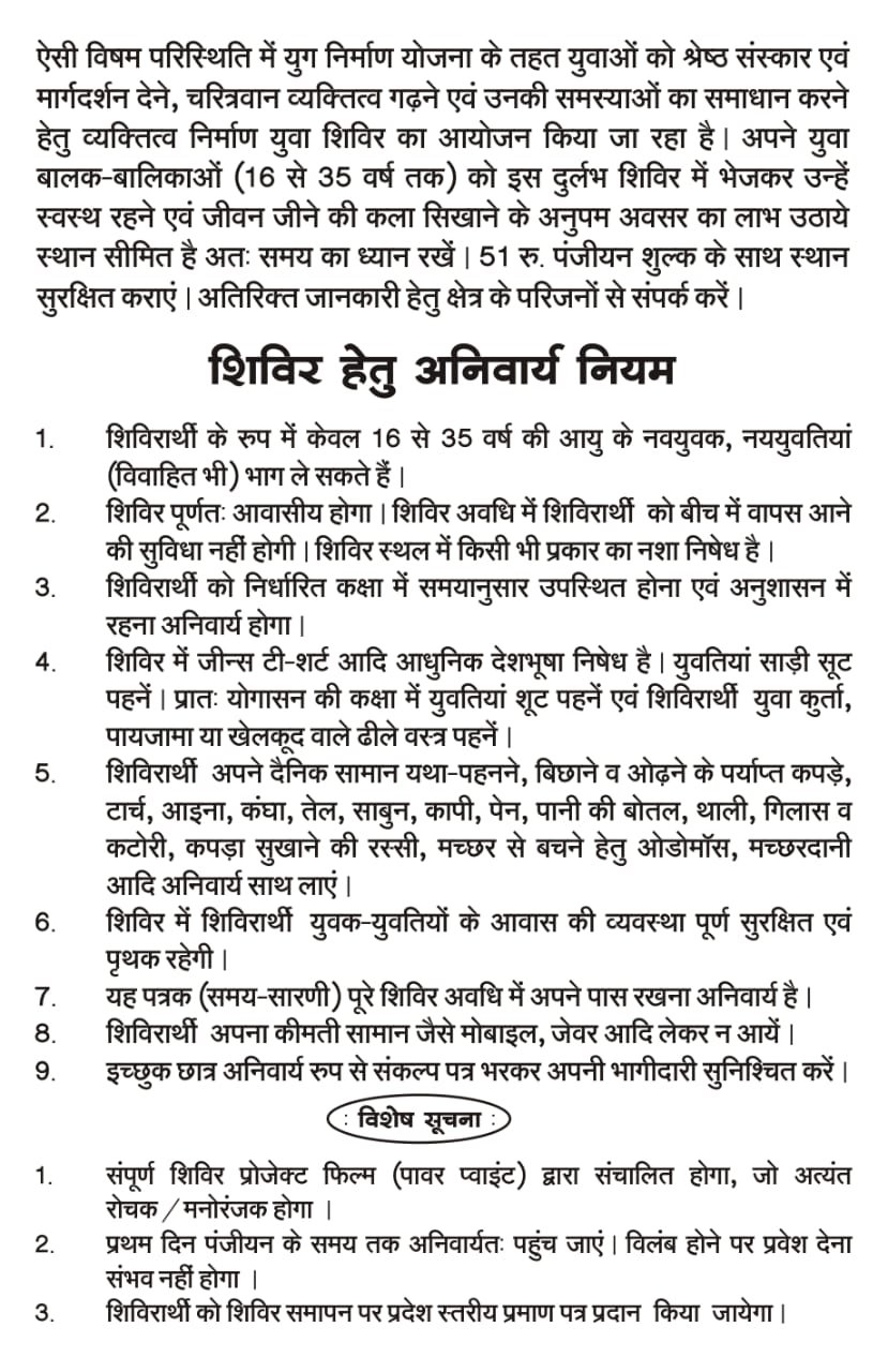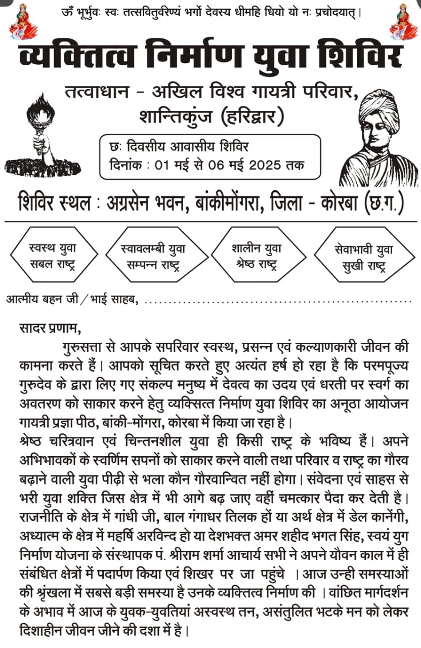 व्यक्तित्व निर्माण युवा शिविर का होगा आयोजन,1 मई से बाँकी मोंगरा के अग्रसेन भवन में…