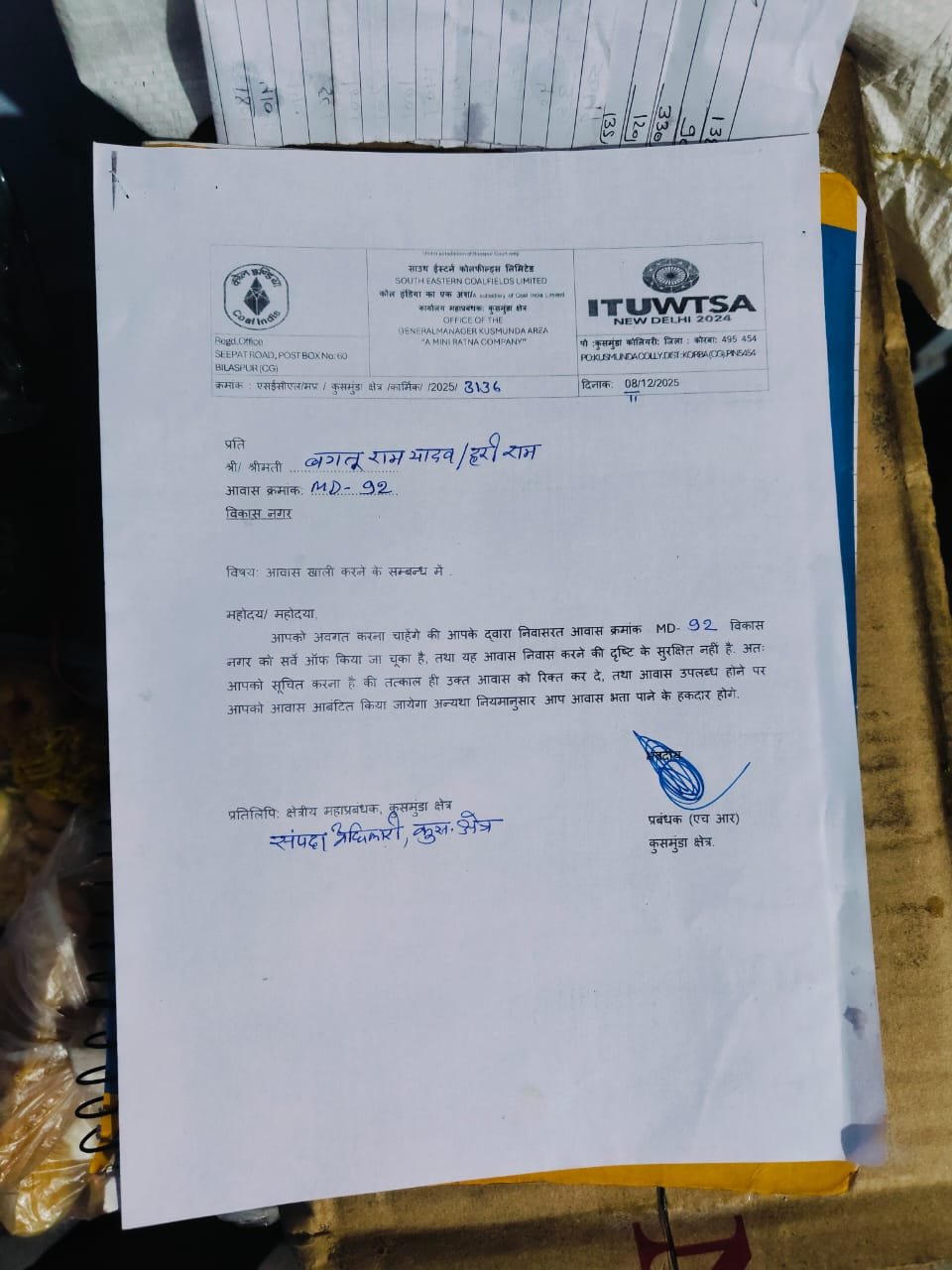 सर्वे ऑफ हो चुके एमडी कॉलोनी को तत्काल खाली करने के आदेश,पार्षद गीता गभेल ने जीएम से मांगी मोहलत…
