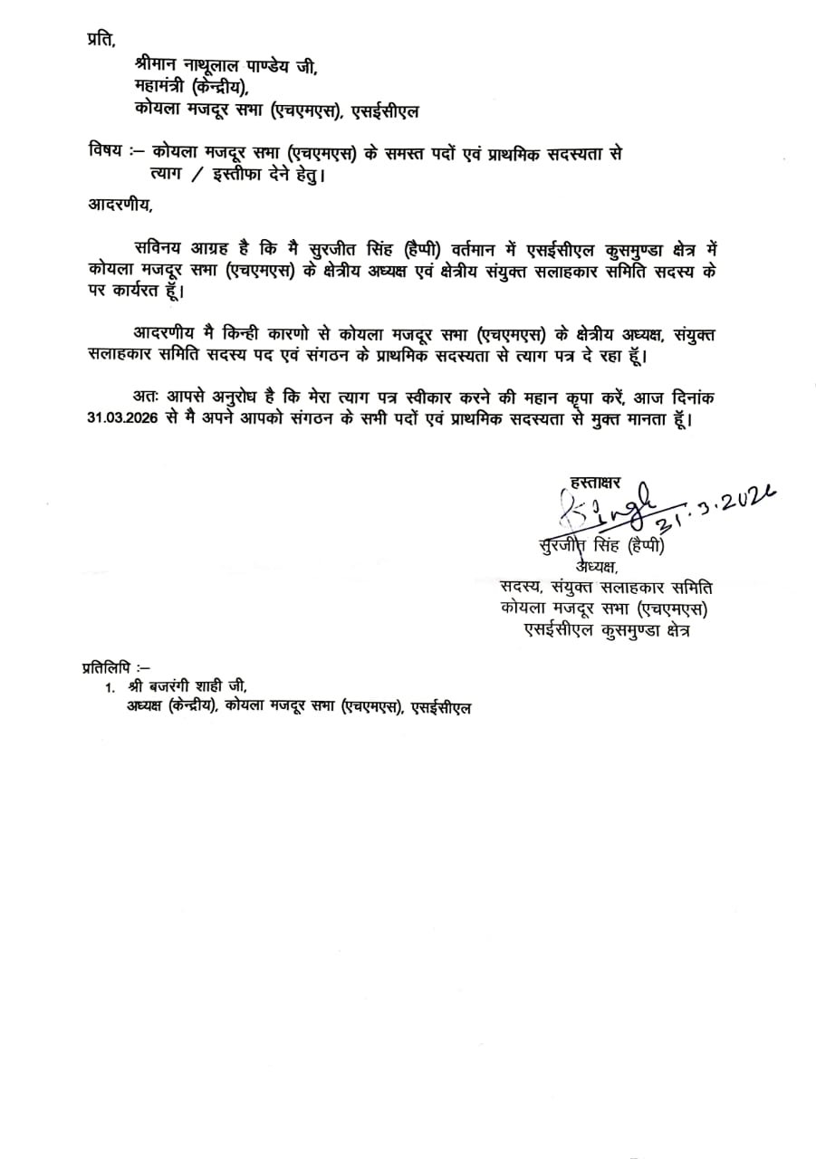 कोरबा – जिले के एसईसीएल कुसमुण्डा क्षेत्र में कोयला मजदूर सभा (एचएमएस) के क्षेत्रीय अध्यक्ष एवं क्षेत्रीय संयुक्त सलाहकार समिति सदस्य सुरजीत सिंह (हैप्पी) ने बीते 31 मार्च को यूनियन ने के समस्त पदों एवं प्राथमिक सदस्यता से इस्तीफा दे दिया । उन्होंने उक्त बातें नाथूलाल पाण्डेय, महामंत्री (केन्द्रीय), कोयला मजदूर समा (एचएमएस), एसईसीएल को पत्र लिखकर कही है।