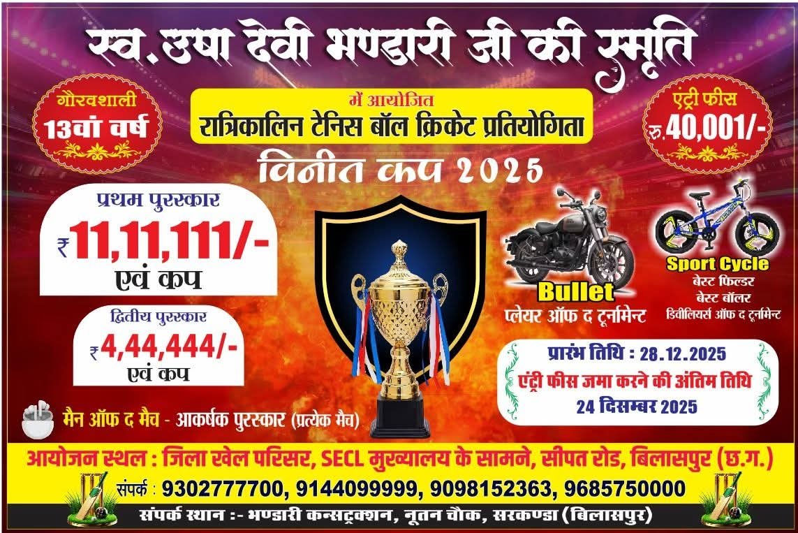 बिलासपुर छत्तीसगढ़ -हर वर्ष की तरह इस वर्ष भी मेरी स्वर्गीय माता ऊषा देवी भंडारी जी के स्मृति में क्रिकेट टूर्नामेंट का आयोजन इस माह दिसंबर में होने जा रहा है।निक्कू भंडारी ने आगामी कार्यक्रम के बारे में विस्तार से बताया एवं आगे के कार्यक्रम की जानकारी दी- आप सभी को बताते हुए मुझे बहुत खुशी हो रही है कि आप सभी के सहयोग और स्नेह से इस बार यह प्रतियोगिता का 13वा वर्ष है। जिसमें हर बार की तरह छत्तीसगढ़ के साथ साथ अन्य राज्यों से भी टीमें शामिल होगी। इस प्रतियोगिता के पूर्व भी मेरे द्वारा मेरी माता जी की स्मृति में कबड्डी प्रतियोगिता का आयोजन भी कराया जा चुका है। इस रात्रिकालीन क्रिकेट प्रतियोगिता को जैसा प्रेम और साथ शहर वासियों ने दिया उससे हमारा उत्साह और जिम्मेदारी और बढ़ गई कि हम प्रत्येक वर्ष इस आयोजन को और बेहतर कर सकें।हमारा प्रयास रहता है कि खिलाड़ियों और दर्शकों को हम अधिक से अधिक सुविधाएं प्रदान कर सके जिससे खेल का अनुभव और अच्छा हो।इस वर्ष भी दूसरे दूर से आई हुई टीमों को रुकने और अन्य सारी व्यवस्थाएं समिति द्वारा की जाएगी। इस बार हमारे आयोजन की इनामी राशि 11 लाख 11 हजार 111 रुपए एवं चमचमाती ट्रॉफी रखी गई है जो कि लाइट वेट टेनिस बाल प्रतियोगिता में पूरे देश में सबसे ज्यादा इनामी राशि है। पूरे टूर्नामेंट लाइव प्रसारण भी किया जाएगा।