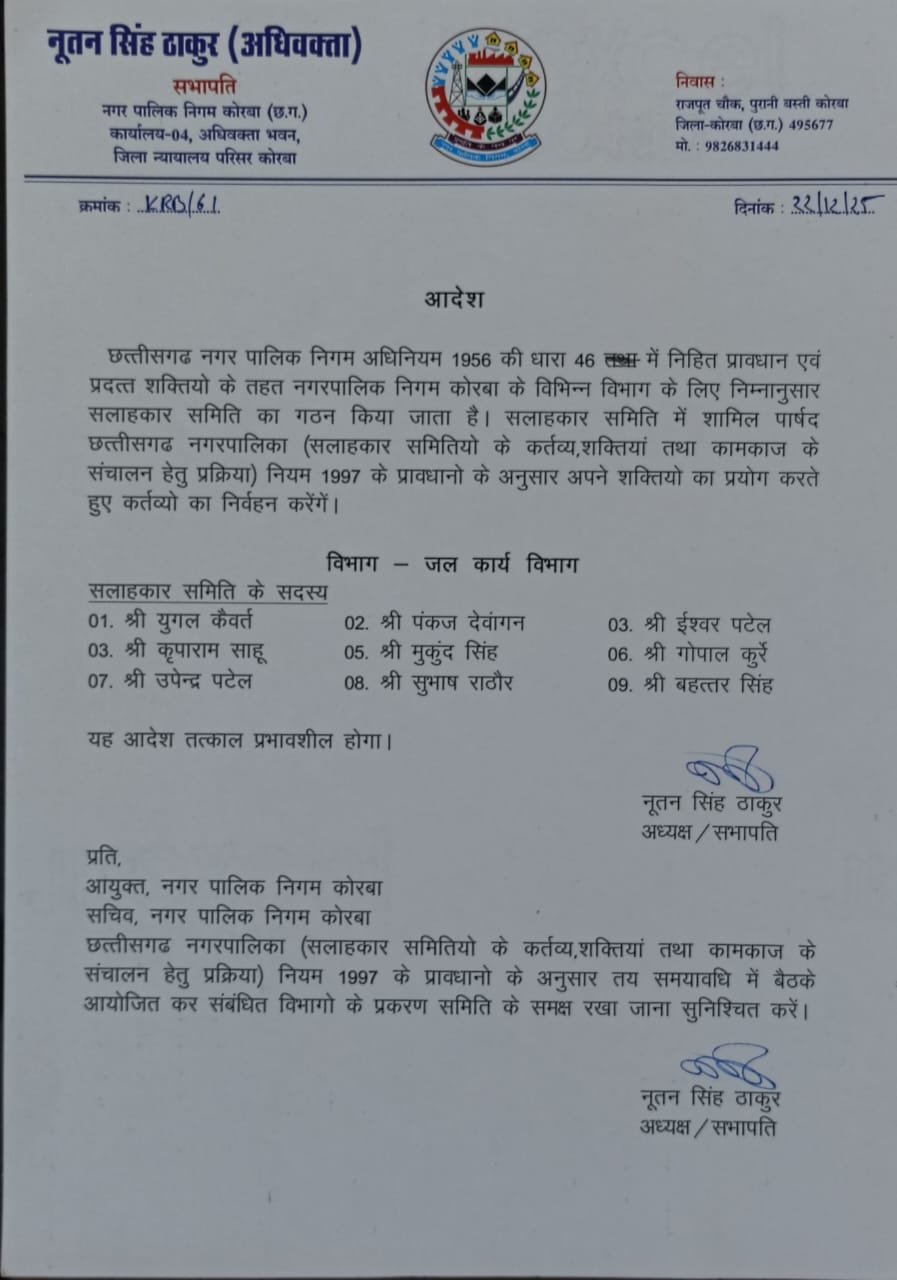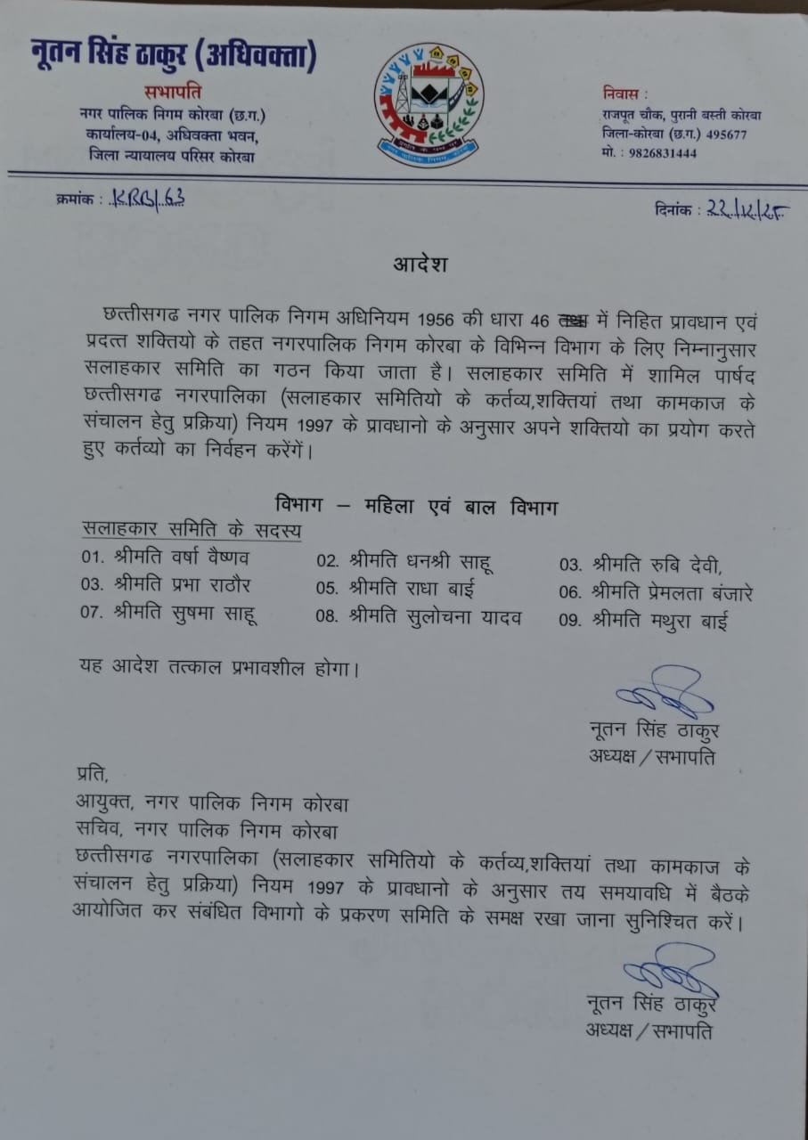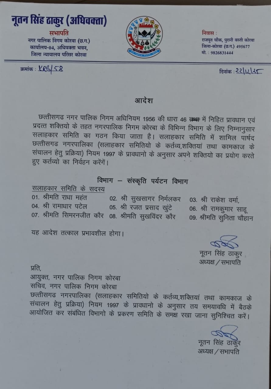 नगर पालिका निगम कोरबा के सभापति व अध्यक्ष नूतन सिंह ठाकुर ने छत्तीसगढ़ नगर निगम अधिनियम के तहत विभिन्न सलाहकार समितियां का गठन किया है। निगम सभापति नूतन सिंह ठाकुर ने इससे पहले भी दो समितियां का गठन किया था, इस बार चार विभागों के लिए गठित समितियां में 36 पार्षदों को स्थान दिया गया है जिसमें भाजपा, कांग्रेस और निर्दलीय पार्षद शामिल हैं। निगम अध्यक्ष नूतनसिंह ठाकुर द्वारा अधिनियम की धारा 46 के तहत आदेश जारी कर उद्यानिकी विभाग के सलाहकार समिति में तरुण राठौर, विनम्र तिवारी, बद्री किरण, अनुज जायसवाल, चेतन सिंह मैत्री, श्रीमती चंदाबाई, श्रीमती सीमा कंवर ,श्रीमती चंद्रकाली जायसवाल, श्रीमती सम्मत कुंवर कों शामिल किया गया है। इसी प्रकार जल कार्य विभाग समिति में युगल कैवर्त , पंकज देवांगन, ईश्वर पटेल, कृपाराम साहू, मुकुंद सिंह कंवर, गोपाल कुर्रे, उपेंद्र पटेल, सुभाष राठौड़ और बहत्तर सिंह शामिल किए गए हैं। महिला एवं बाल विभाग समिति में निगम के महिला पार्षदों को शामिल कर समिति बनाया गया है जिसमें श्रीमती वर्षा वैष्णव, श्रीमती धनश्री साहू, श्रीमती रूबी देवी, श्रीमती प्रभा राठौर, श्रीमती राधाबाई, श्रीमती प्रेमलता बंजारे, श्रीमती सुषमा साहू, श्रीमती सुलोचना यादव, श्रीमती मथुरा बाई को शामिल है। संस्कृति एवं पर्यटन विभाग समिति में श्रीमती राधा महंत, सुखसागर निर्मलकर, राकेश वर्मा, रामाधार पटेल, रजत खुटे, रामकुमार साहू, श्रीमती सिमरनजीत कौर, श्रीमती सुखविंदर कौर, श्रीमती सुनीता चौहान को शामिल करते हुए समिति गठित की गई है।