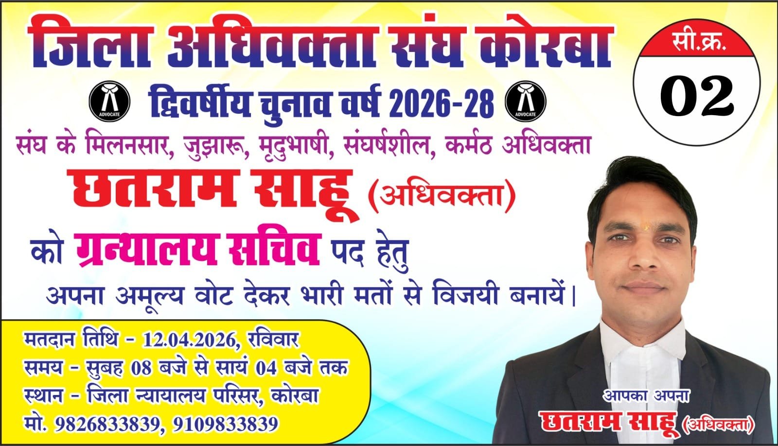 जिला अधिवक्ता संघ, कोरबा के द्विवार्षिक चुनाव 2026-28 में ग्रन्थालय सचिव पद के लिए अधिवक्ता छतराम साहू का नाम तेजी से उभरकर सामने आ रहा है। बार के वरिष्ठ अधिवक्ताओं से लेकर युवा वकीलों तक, हर वर्ग में उन्हें व्यापक समर्थन मिल रहा है।