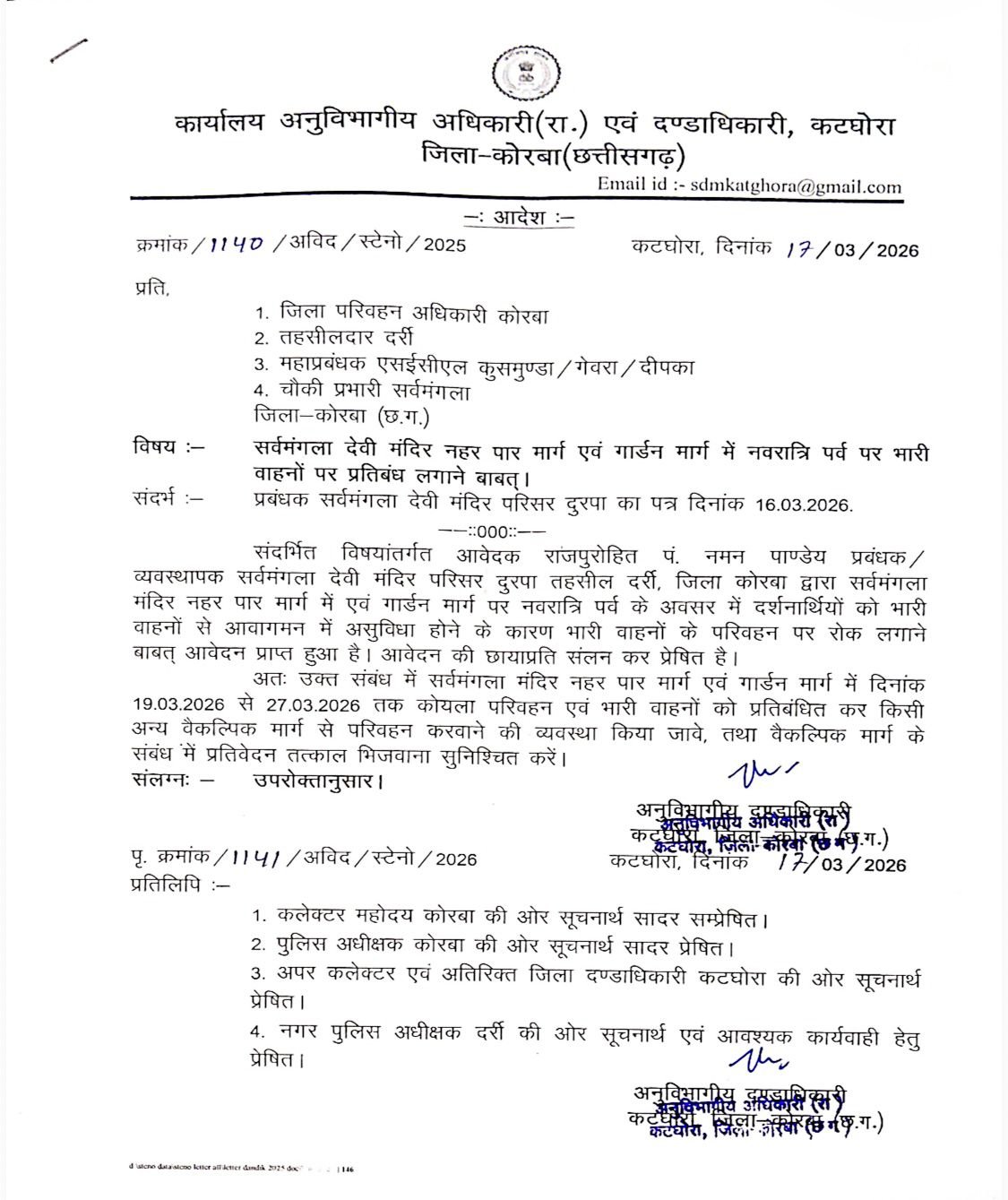 कोरबा – चैत्र नवरात्रि के अवसर पर जिले के मां सर्वमंगला मंदिर में श्रद्धालुओं की भारी भीड़ को देखते हुए मंदिर प्रबंधन द्वारा भारी वाहनों के लिए नो एंट्री की मांग की गई है, जिस पर प्रशासन द्वारा सर्वमंगला मंदिर रोड, गार्डन रोड में 19 मार्च से 27 मार्च तक भारी वाहनों की एंट्री बंद की जाएगी। फिलहाल अभी औपचारिक नोटिस जारी नहीं हुआ,लेकिन जनहित में जल्द ही ये फैसला ले लिया जाएगा। जिसके बाद से  कुसमुंडा 4 नंबर बेरियर और कनकी होते हुए पंतोरा की ओर भारी वाहन आवागमन बंद हो जायेगा और उन्हें आगे नौ दिनों तक कोरबा की ओर से आवागमन करना होगा।
