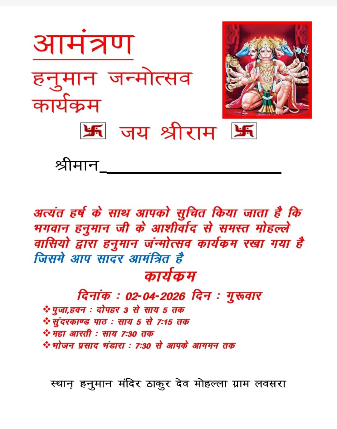 सक्ती: : आगामी 2 अप्रैल 2026 को जिला मुख्यालय के नया बाराद्वार तहसील के ग्राम लवसरा मे हनुमान प्रकट उत्सव का भव्य आयोजन किया जायेगा जो की विगत कई वर्षो से किया जा रहा है उपरोक्त जानकारी देते हुए आयोजक समिति के सदस्य एवं धर्म प्रेमी आकाश साहू ने बताया की हनुमान जन्मोत्सव के दिन दोपहर से पूजन हवन सुन्दर कांठ पाठ एवं भंडारे का भव्य आयोजन हनुमान जी की कृपा से आयोजित किया जायेगा जिसमे उन्होंने समस्त मित्रो साथियों एवं आस पास के धर्म प्रेमियों राम रामायण भक्तो को अपने इष्ट मित्रो परिवार जनों सहित सादर आमंत्रित किया एवं प्रभु हनुमान जी का पूजन हवन सुन्दर कांठ पाठ मे सम्मिलित हो कर अपने आपको पुण्य के लाभ प्राप्त करने आग्रह किया है एवं सभी को हनुमान जन्मोत्सव की बधाई एवं शुभकामनायें भी प्रेषित किया है