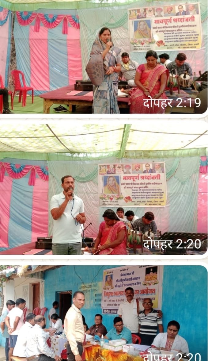 सक्ती : मालखरौदा विकासखंड अंतर्गत ग्राम अंडी में बसपा नेता संजीव भारद्वाज के घर 3 दिसंबर, बुधवार को उनके माता जी श्रीमती दुखीन बाई के दशगात्र के मौके पर स्वास्थ्य शिविर आयोजित किया गया। इस अवसर पर आयोजित स्वास्थ्य शिविर में अंडी ग्राम वासियों सहित दशगात्र में शामिल होने पहुंचे लोगों ने अपना स्वास्थ्य लाभ लिया। इस संबंध में बसपा नेता जिला सचिव संजीव भारद्वाज ने बताया कि मेरी मां सदैव कहती थी कि हमें अपने स्वास्थ्य के प्रति सचेत रहने चाहिए। क्योंकि स्वस्थ व्यक्ति ही जीवन का सही मायनों में आनंद ले सकता है बाकी दुखी जन तो सदैव रोते -बिलखते रहता है। माता जी के इस सीख को आत्मसात करते हुए हमने ये स्वास्थ्य शिविर आयोजित किया है। ताकि जनसाधारण को इसका लाभ मिले। इधर दशगात्र के मौके पर बसपा नेता के इस मानवीय पहलू की लोग सराहना करते दिखे। वहीं इस अवसर स्व. श्रीमती दुखीन बाई को श्रद्धा सुमन अर्पित करने सभी दलों के लोग पहुंचे हुए थे। इनमें जिला पंचायत सदस्य श्रीमती पूर्णिमा -चंद्रप्रकाश खुंटे, जिला युथ कांग्रेस अध्यक्ष प्रताप चंद्रा, जनपद सदस्य प्रद्युम्न लहरे, पूर्व बीडीसी बाबू लाल चंद्रा, पिहरीद सरपंच दयालु राम जाटवर, अण्डी सरपंच सूरज महिलांगे, चेतन बौद्ध, उदय मधुकर, योम प्रकाश लहरे सहित बड़ी संख्या में लोग पहुंचे हुए थे।‌ इस मौके पर मशहूर गायक हरिप्रेमी व उनके टीम ने श्रद्धांजलि सभा में अपनी संगीतमय प्रस्तुति से पहले दिवंगत आत्मा को श्रद्धांजलि दी।