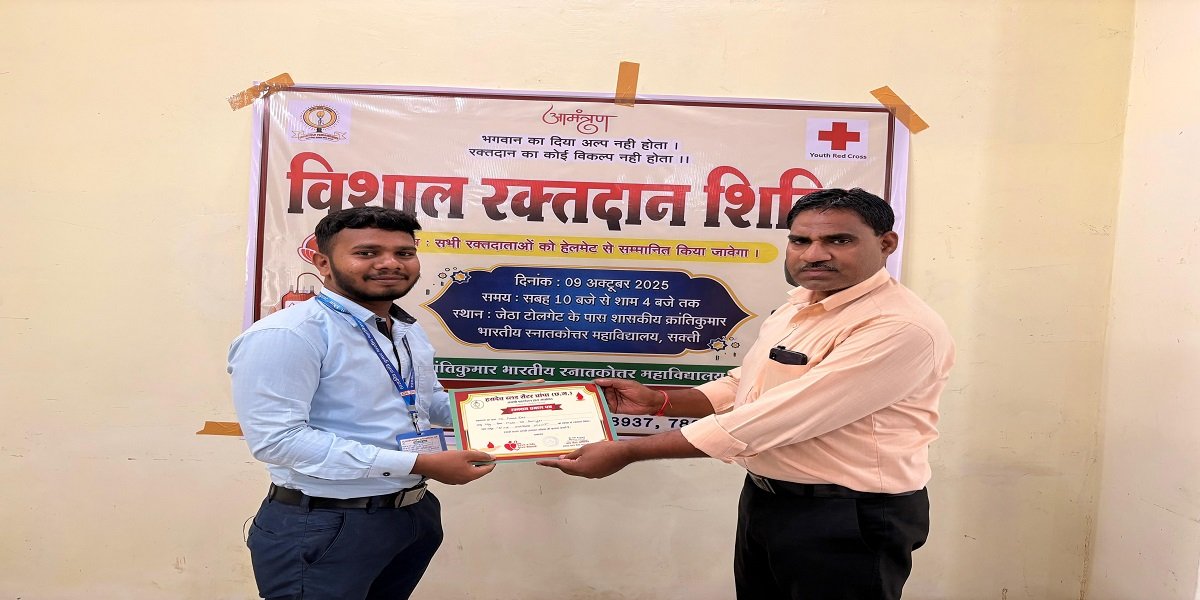 रक्तदान करने वाले छात्र छात्राओं को हेलमेट एवम् प्रमाण पत्र प्रदान किया गया। रक्तदान द्वारा प्राप्त ब्लड का उपयोग जरूरतमंद मरीजों के इलाज में किया जाएगा।कार्यक्रम का आयोजन महाविद्यालय के प्राचार्य डॉ डी पी पाटले एवम् यूथ रेड क्रॉस प्रभारी प्रो ऋतु पटेल के मार्गदर्शन में आयोजित किया गया l