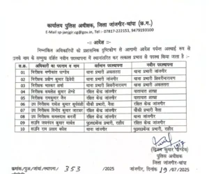 जांजगीर-चांपा : जिले के पुलिस विभाग में प्रशासनिक दृष्टिकोण से बड़े पैमाने पर फेरबदल किया गया है। पुलिस अधीक्षक कार्यालय से जारी आदेशानुसार 10 पुलिस अधिकारियों का स्थानांतरण तत्काल प्रभाव से किया गया है। यह आदेश जिले में कानून-व्यवस्था को और अधिक मजबूत करने तथा प्रशासनिक कार्यों में सुगमता लाने के उद्देश्य से जारी किया गया है।