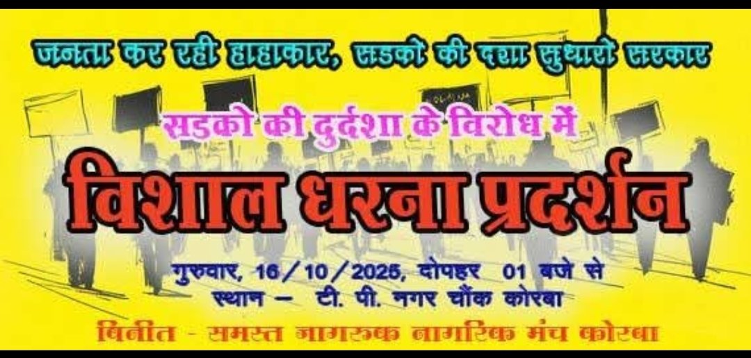 ब्रेकिंग कोरबा – सड़कों की दुर्दशा के विरोध में टीपी नगर चौक में होगा विशाल धरना प्रदर्शन
