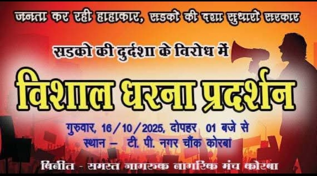 ब्रेकिंग कोरबा – सड़कों की दुर्दशा के विरोध में टीपी नगर चौक में होगा विशाल धरना प्रदर्शन