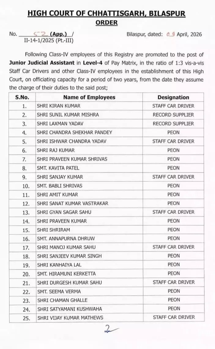 बिलासपुर : छत्तीसगढ़ के बिलासपुर स्थित हाई कोर्ट रजिस्ट्री में कार्यरत कर्मचारियों के लिए बड़ी खबर सामने आई है। हाई कोर्ट ने 25 कर्मचारियों को पदोन्नति का लाभ देते हुए आधिकारिक आदेश जारी किया है। इस निर्णय से कर्मचारियों में उत्साह का माहौल है। पदोन्नत होने वाले कर्मचारियों में स्टाफ कार चालक, रिकॉर्ड आपूर्तिकर्ता, चपरासी सहित श्रेणी-IV के विभिन्न पदों पर कार्यरत कर्मचारी शामिल हैं। इन सभी को अब कनिष्ठ न्यायिक सहायक के पद पर पदोन्नत किया गया है।