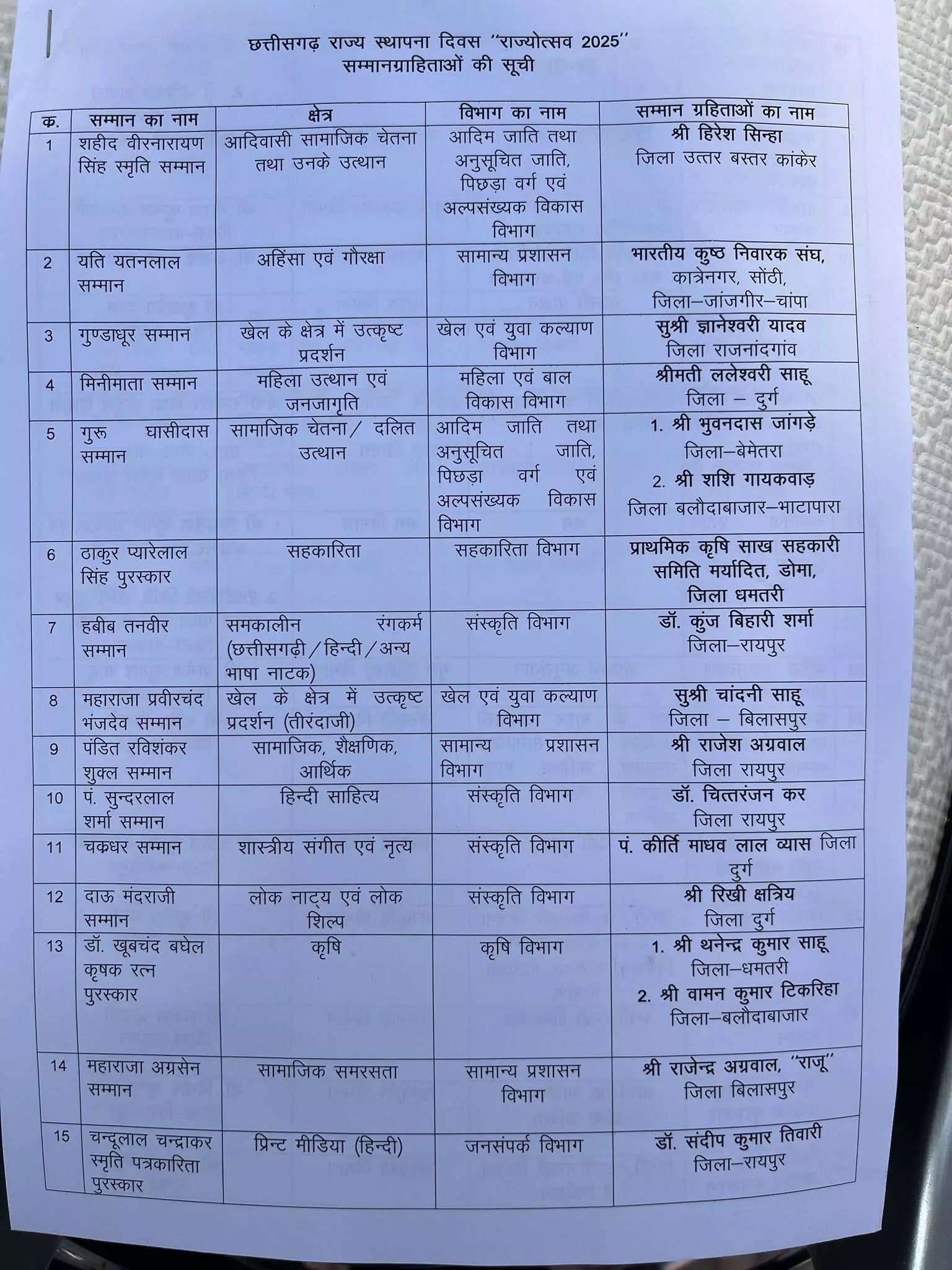 रायपुर : छत्तीसगढ़ में राज्य अलंकरण सम्मान की घोषणा कर दी गई है। राज्योत्सव कार्याक्रम के समापन में देश के उपराष्ट्रपति सीपी राधाकृष्णन सम्मानित करेंगे।