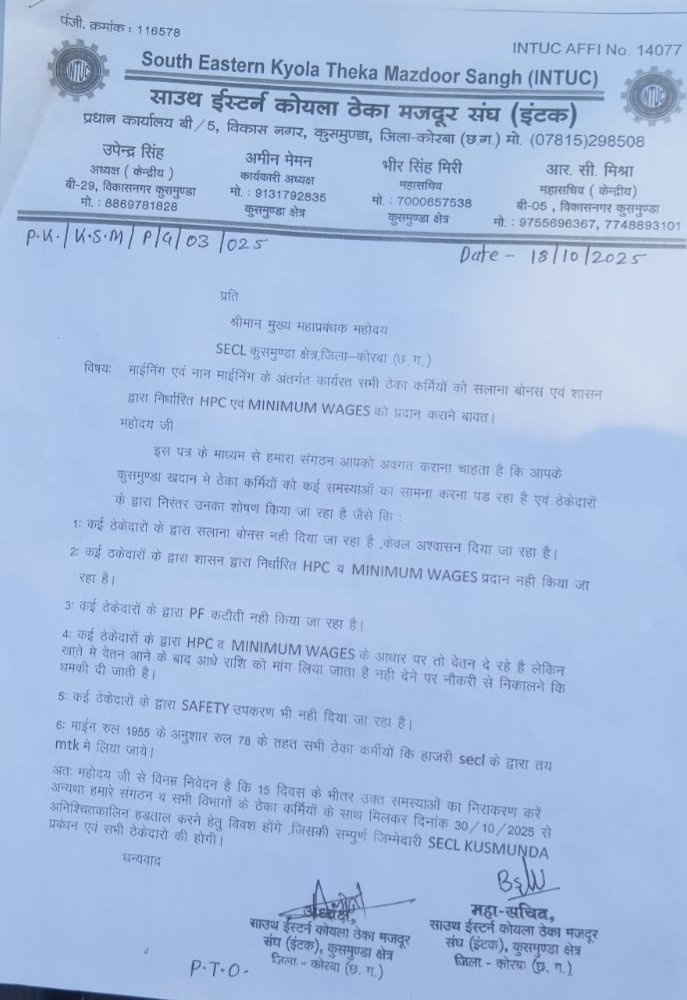 अतः 15 दिवस के भीतर उक्त समस्याओं का निराकरण करें अन्यथा हमारे संगठन व सभी विभागों के ठेका कर्मियों के साथ मिलकर दिनांक 30/10/2025 से अनिश्चितकालिन हड़ताल करने हेतु विवश होंगे जिसकी सम्पूर्ण जिम्मेदारी SECL KUSMUNDA प्रबंधन एवं सभी ठेकेदारों की होगी। इस अवसर पर इंटक के शीर्ष नेता आर सी मिश्रा, अमीन मेमन, भीर सिंह मिरी सहित सैकड़ों के संख्या में कार्यकर्ता और ठेका कामगार शामिल रहें।