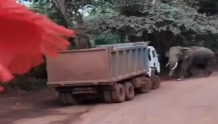 सड़क पर हाथी की दहशत: हाईवा का रास्ता हाथी ने रोका ड्राइवर ने समय रहते पीछे करके बचाई जान, वन विभाग अलर्ट