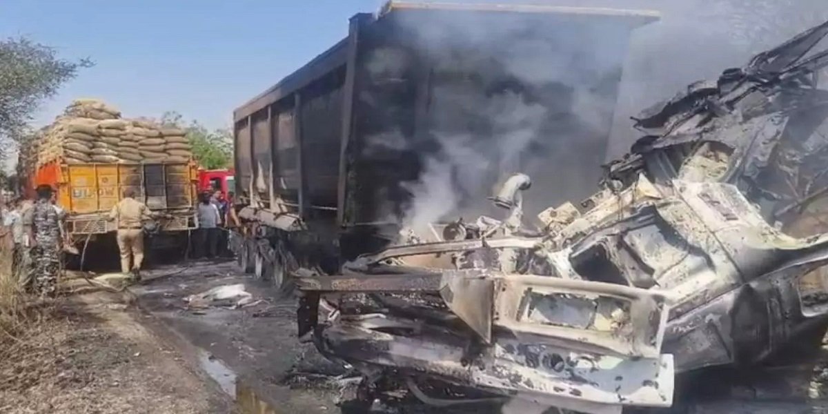 भीषण टक्कर के बाद क्लिंकर से भरे ट्रक में लगी आग, चालक ट्रक में ही फंसा रह गया और जिंदा जलने से मौके पर ही दर्दनाक मौत