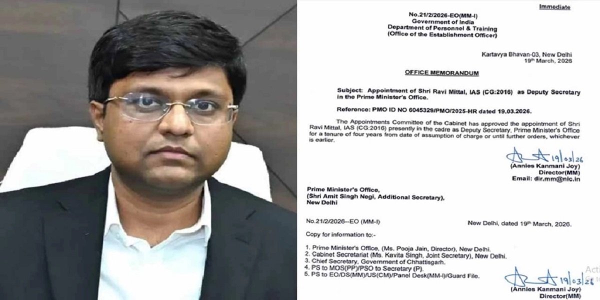 IAS Ravi Mittal: केंद्र सरकार ने छत्तीसगढ़ कैडर के 2016 बैच के आईएएस अधिकारी रवि मित्तल को प्रधानमंत्री कार्यालय (PMO) में डिप्टी सेक्रेटरी पद पर नियुक्त किया है। यह नियुक्ति कैबिनेट की नियुक्ति समिति (ACC) की मंजूरी के बाद की गई है। कार्मिक एवं प्रशिक्षण विभाग (DoPT) द्वारा जारी आदेश के मुताबिक, रवि मित्तल का कार्यकाल पदभार ग्रहण करने की तारीख से चार वर्ष का होगा या अगले आदेश तक प्रभावी रहेगा।