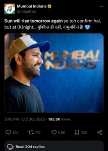मुंबई इंडियंस की फ्रेंचाइजी ने अभिषेक नायर का केकेआर टीम के हेड कोच बनने के बाद सोशल मीडिया प्लेटफॉर्म पर रोहित शर्मा की फोटो के साथ पोस्ट करते हुए लिखा कि सूरज अगले दिन दुबारा उगेगा ये बात तय है, लेकिन नाइट में ये मुश्किल ही नहीं, नामुमकिन है! मुंबई इंडियंस के इस पोस्ट से साफतौर पर समझा जा सकता है कि उन्होंने रोहित शर्मा के किसी और फ्रेंचाइजी में खेलने की अटकलों को पूरी तरह से खत्म करना चाहा है।