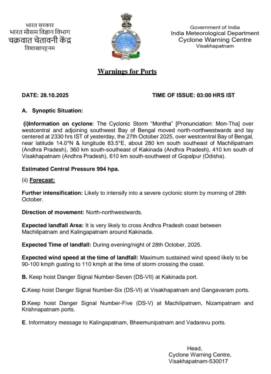 चक्रवात मोन्था गंभीर तूफान में बदल गया है। मौसम विभाग के मुताबिक तूफान विशाखापट्टनम की तरफ 18kmph की रफ्तार से आगे बढ़ रहा है। जैसे-जैसे यह काकीनाड़ा-मछलीपट्टनम तट के करीब पहुंचेगा तेज होता जाएगा। प्रदेश के तटीय जिलों में बारिश और 90 से 110kmph की रफ्तार से आंधी चल रही है।