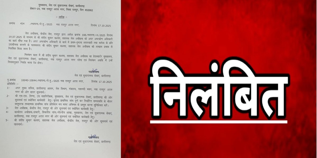 वायरल वीडियो के बाद सहायक जेल अधीक्षक संदीप कुमार कश्यप को तत्काल प्रभाव से निलंबित कर दिया है। जेल एवं सुधारात्मक सेवाएं मुख्यालय ने संदीप के निलंबन आदेश में उल्लेख है कि उन्हें 19 जुलाई 2025 को अपर अष्टकोण अधिकारी का दायित्व सौंपा गया था, लेकिन उन्होंने कार्य में प्रथम दृष्टया लापरवाही और कर्तव्य के प्रति उदासीनता बरती। निलंबन अवधि में संदीप कश्यप का मुख्यालय मुख्यालय, जेल एवं सुधारात्मक सेवाएं, नवा रायपुर अटल नगर रहेगा और उन्हें नियम अनुसार निर्वाह भत्ता दिया जाएगा।