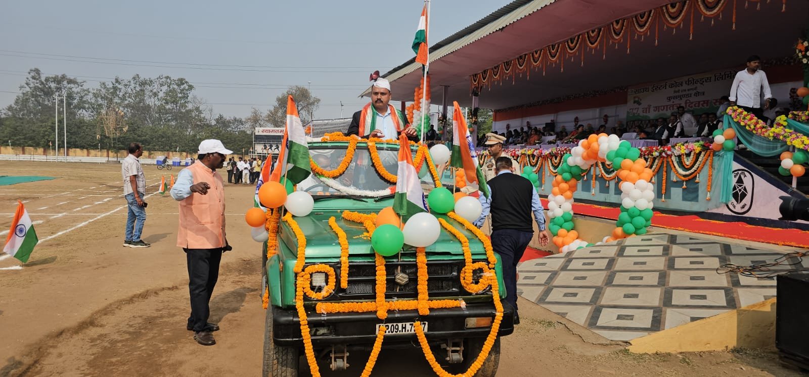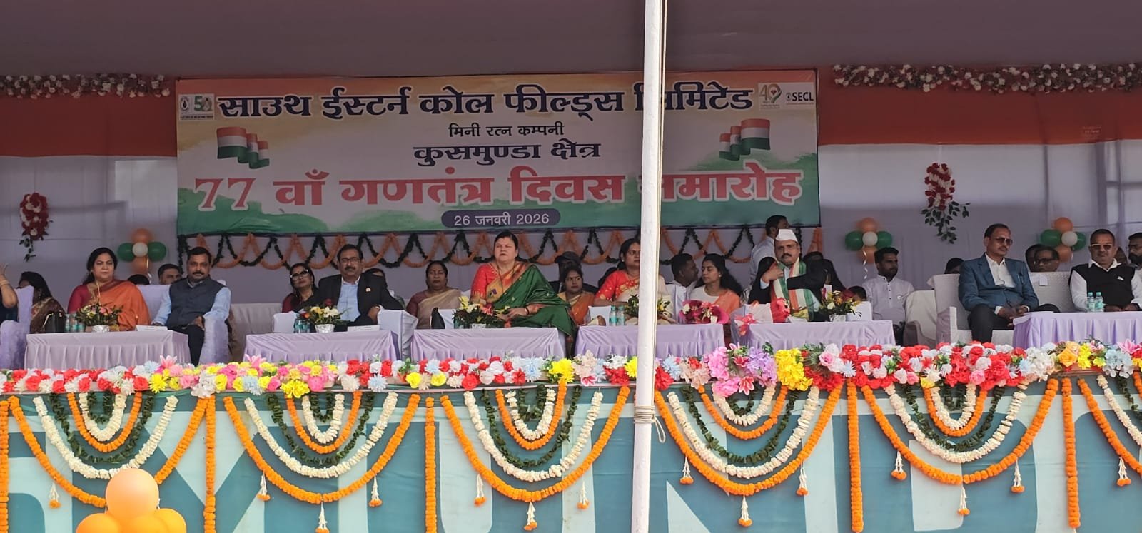 कोरबा – पूरा देश आज 77वाँ गणतंत्र दिवस बहुत ही धूमधाम से मना रहा है। इस अवसर पर कुसमुंडा क्षेत्र अंतर्गत इंदिरा स्टेडियम में SECL एरिया जीएम सचिन ताना जी पाटिल द्वारा ध्वजारोहण किया गया। राष्ट्रगान उपरांत जीएम सचिन तानाजी पाटिल ने परेड की सलामी ली। कुसमुंडा खदान की सुरक्षा में तैनात त्रिपुरा स्टेट रायफल सहित कुसमुंडा क्षेत्र के लगभग सभी स्कूलों के बच्चों ने परेड में हिस्सा लिया। परेड उपरांत सभी श्रमिक संगठन के नेताओं का उद्बोधन शुरू हुआ। जो अभी खबर लिखने तक जारी है। एरिया जीएम सचिन ताना जी पाटिल, जीएम ऑपरेशन अरविन्द कुमार राय, माइनिंग जीएम अतुल बाबू सिंह, एरिया पर्सनल मैनेजर वीरेंद्र कुमार, माइनिंग पर्सनल मैनेजर रोहित श्रीवास्तव सहित श्रमिक संगठनों के नेताओं ने 77 वें गणतंत्र दिवस के अवसर पर समस्त जिले व क्षेत्रवासियों को बधाई शुभकामनाएं प्रेषित की हैं। पूरी खबर आगे अपडेट की जायेगी।