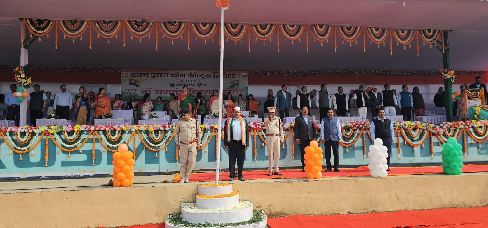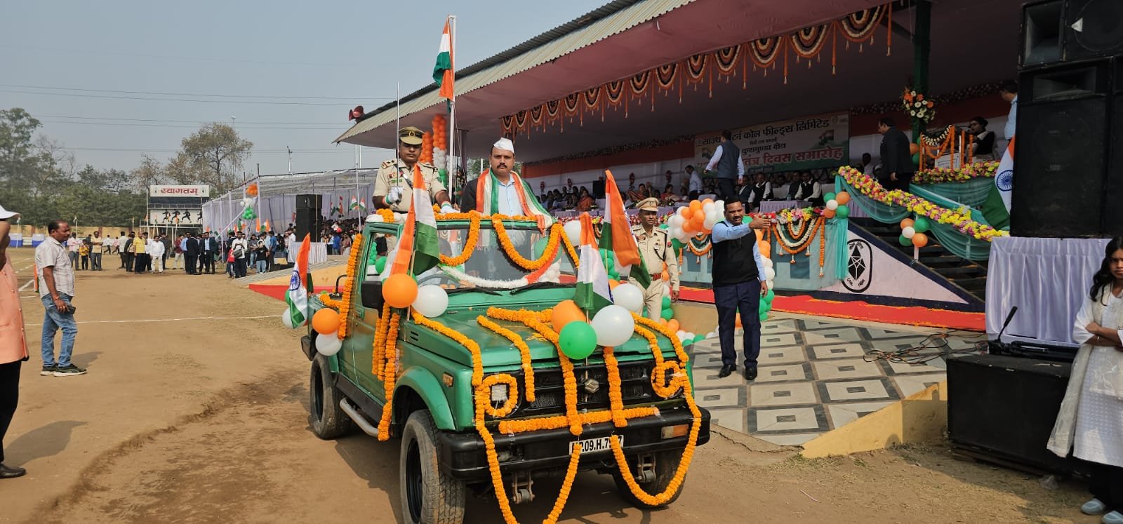 कोरबा – पूरा देश आज 77वाँ गणतंत्र दिवस बहुत ही धूमधाम से मना रहा है। इस अवसर पर कुसमुंडा क्षेत्र अंतर्गत इंदिरा स्टेडियम में SECL एरिया जीएम सचिन ताना जी पाटिल द्वारा ध्वजारोहण किया गया। राष्ट्रगान उपरांत जीएम सचिन तानाजी पाटिल ने परेड की सलामी ली। कुसमुंडा खदान की सुरक्षा में तैनात त्रिपुरा स्टेट रायफल सहित कुसमुंडा क्षेत्र के लगभग सभी स्कूलों के बच्चों ने परेड में हिस्सा लिया। परेड उपरांत सभी श्रमिक संगठन के नेताओं का उद्बोधन शुरू हुआ। जो अभी खबर लिखने तक जारी है। एरिया जीएम सचिन ताना जी पाटिल, जीएम ऑपरेशन अरविन्द कुमार राय, माइनिंग जीएम अतुल बाबू सिंह, एरिया पर्सनल मैनेजर वीरेंद्र कुमार, माइनिंग पर्सनल मैनेजर रोहित श्रीवास्तव सहित श्रमिक संगठनों के नेताओं ने 77 वें गणतंत्र दिवस के अवसर पर समस्त जिले व क्षेत्रवासियों को बधाई शुभकामनाएं प्रेषित की हैं। पूरी खबर आगे अपडेट की जायेगी।