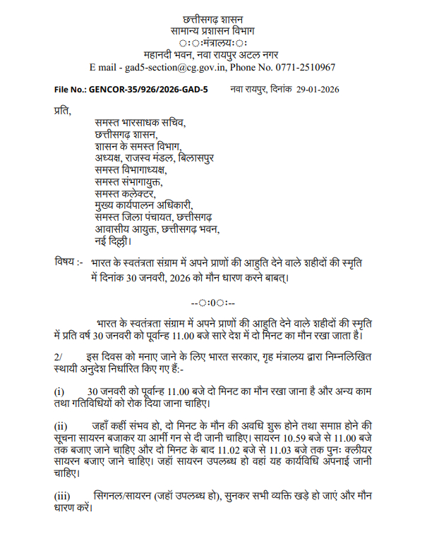 रायपुर : भारत के स्वतंत्रता संग्राम में अपने प्राणों की आहुति देने वाले अमर शहीदों की याद में कल यानी 30 जनवरी को ‘शहीद दिवस’ मनाया जाएगा. इस अवसर पर छत्तीसगढ़ शासन के सामान्य प्रशासन और गृह विभाग ने आदेश जारी कर प्रदेशवासियों से दो मिनट का मौन धारण करने की अपील की है.