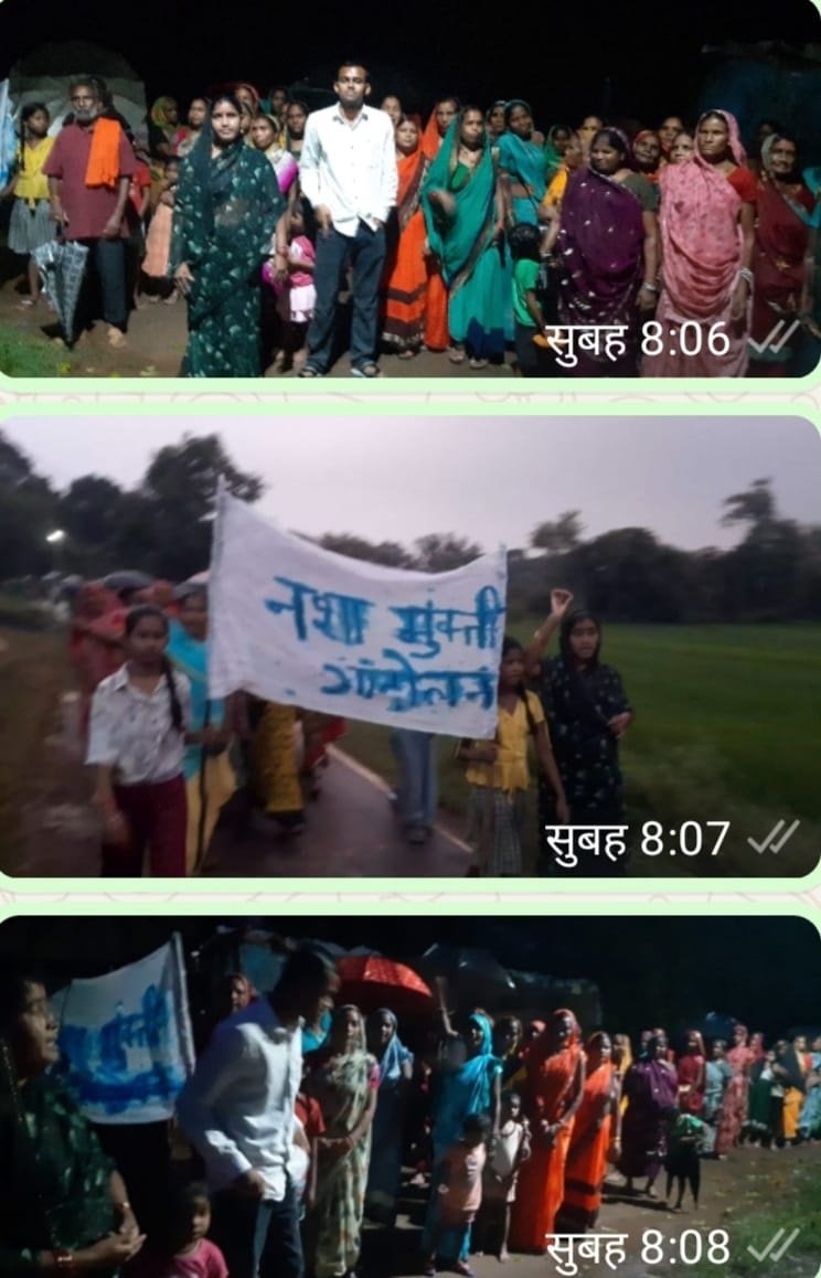 बरसते पानी में भीगते हुए गांव में निकाली शराबबंदी करने रैली...